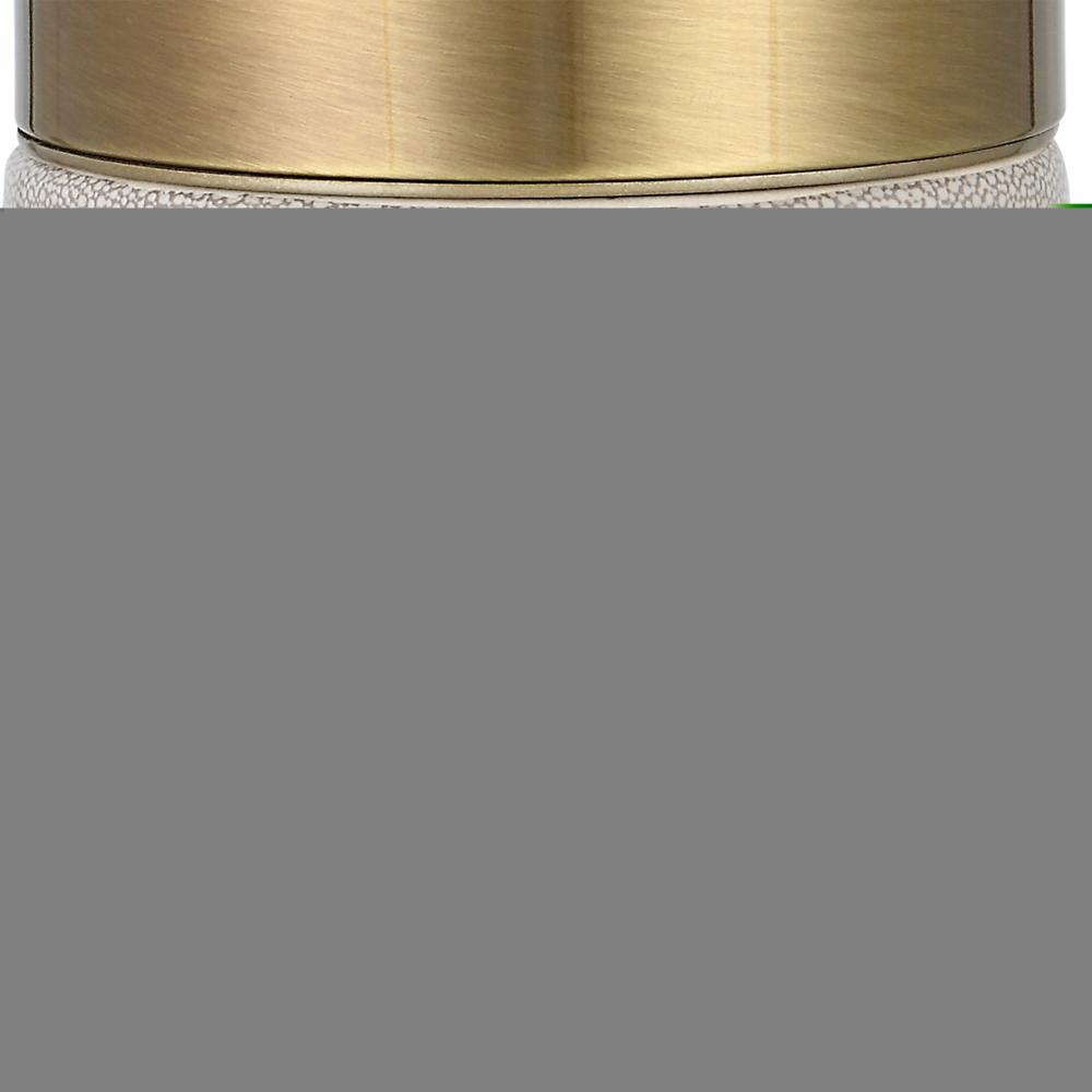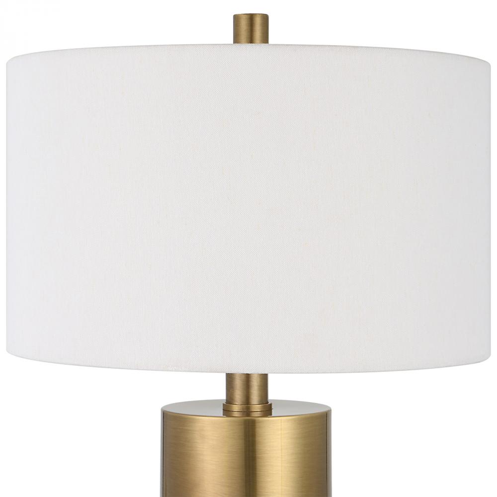 Sophisticated and Versatile, This Table Lamp Displays A Solid Iron Base Finished in Warm Brushed Brass with An Ivory Crackle Glazed Ceramic Center. The Hardback Drum Shade is Covered in A White Cotton Fabric.
