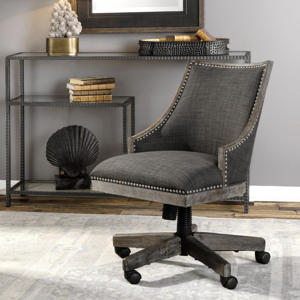 Curved Back Design in Warm Charcoal Gray Linen, Accented By Polished Nickel Nail Head Trim. Honey-stained Frame is Finished with Heavy Gray Wash. Seat Height is Adjustable From 21" to 25".