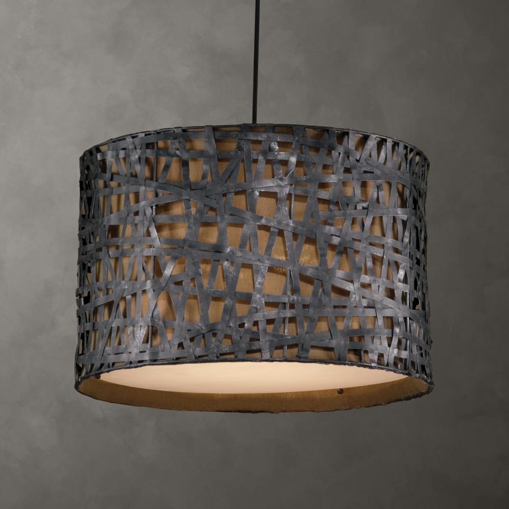 Straps of Metal Finished in A Rust Black with Aged Silver Undertones and A Silken Bronze Fabric Liner.3-60 Watt Max, Edison Sockets. Bulbs Not Included. Supplied with 15' Cord for Adjustable Installation.