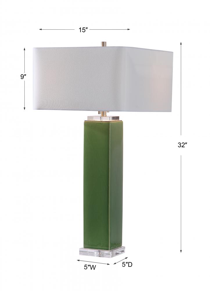 Finished in A Striking Tropical Green Glaze, This Ceramic Table Lamp is Accented By Thick Crystal Ornaments and Brushed Nickel Accents. The Square Hardback Shade is A White Linen Fabric.