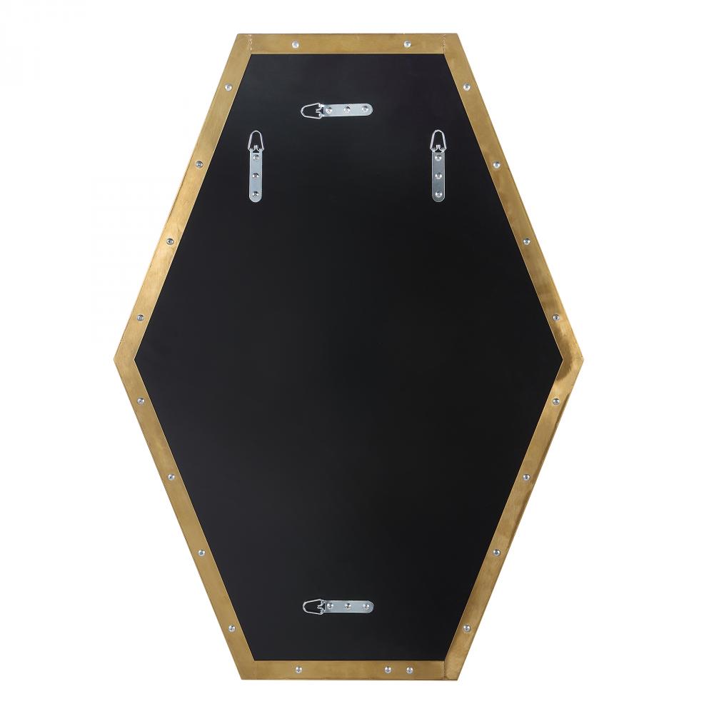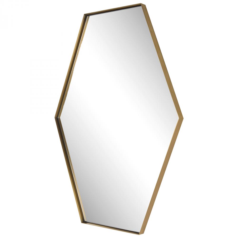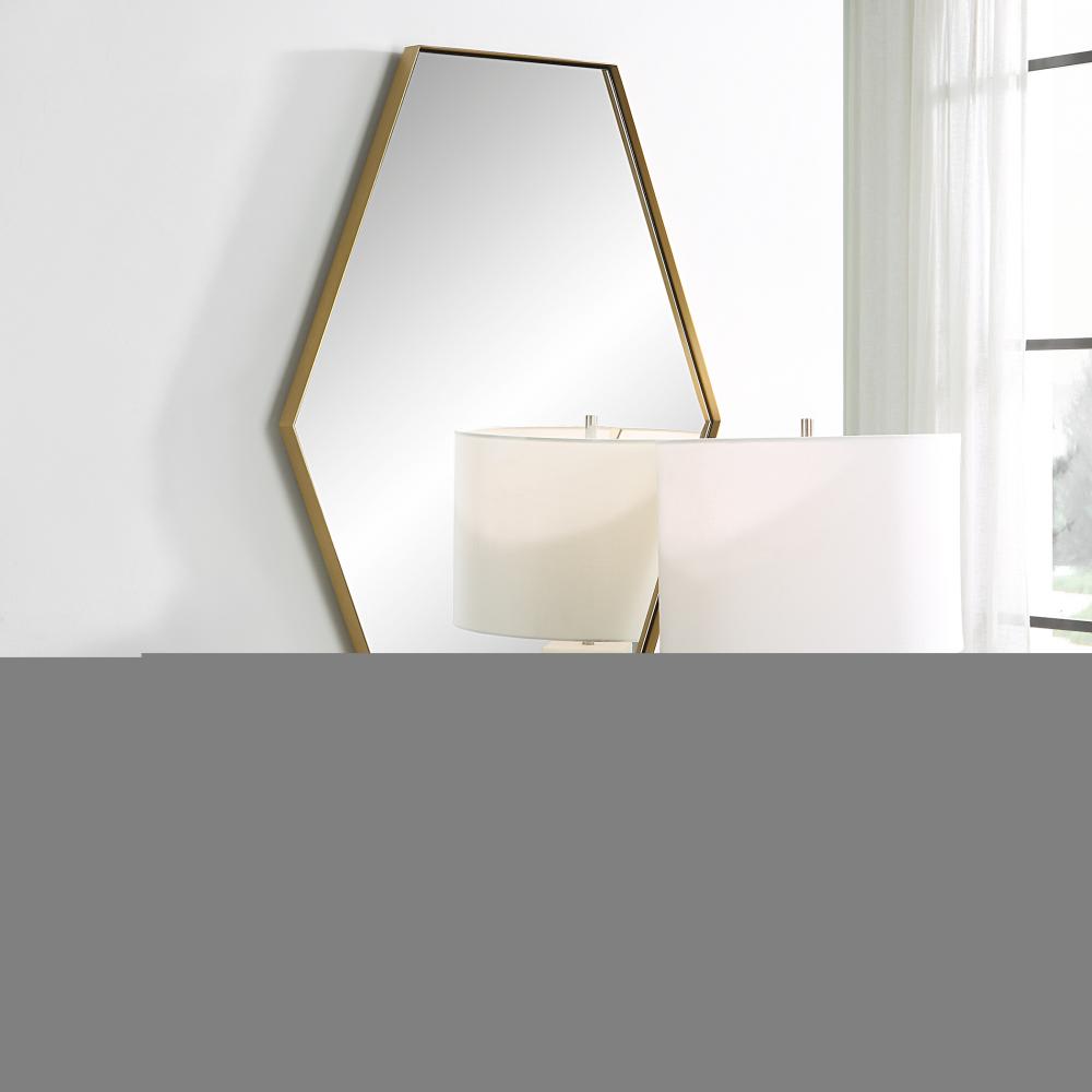 This Hexagon Mirror Features A Contemporary Style Using A Stainless Steel Frame Finished in A Plated Brushed Brass, Surrounding A Floating Style Polished Edge Mirror. May Be Hung Horizontal or Vertical.