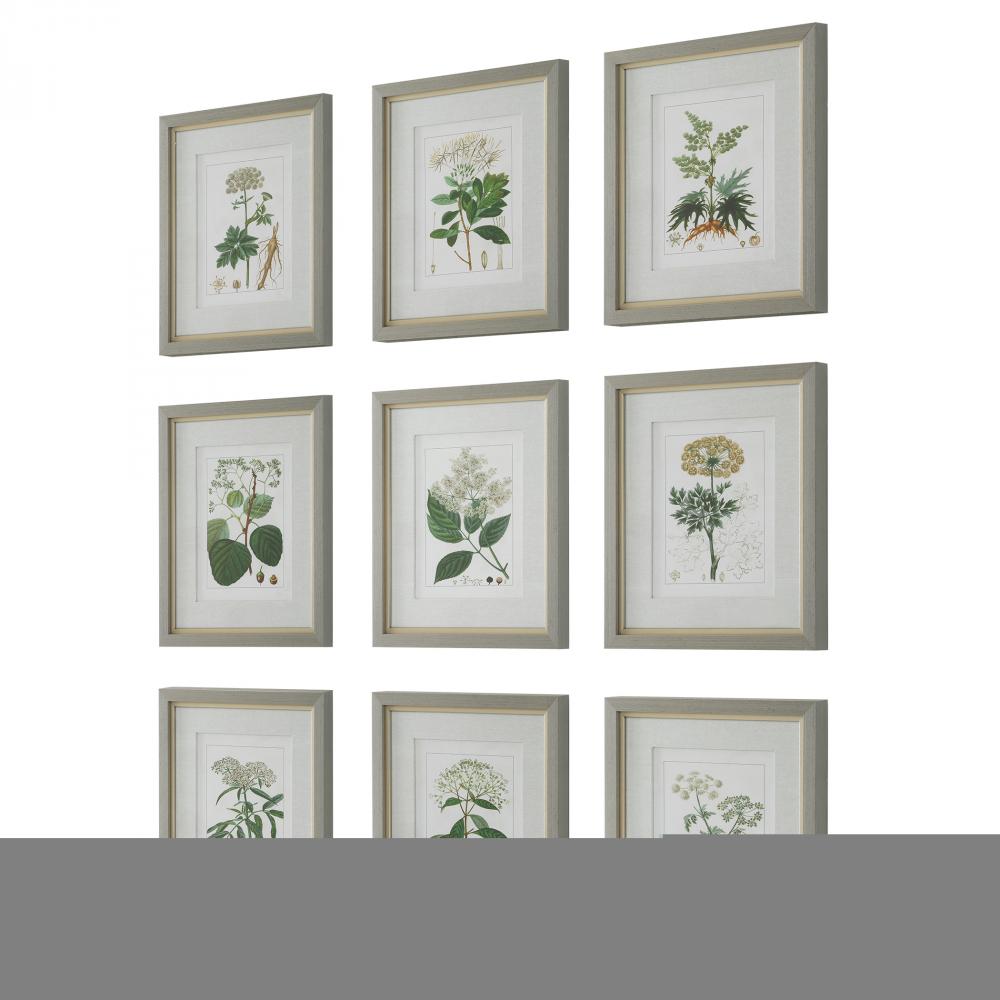 This Set of Nine Botanical Prints Were Originally Created By French Botanist and Illustrator Pierre Turpin in The Early 19th Century. Each Work of Art is Accented By An Oatmeal Linen Wrapped Mat and A Light Gray Wood Tone Frame with A Petite Champagne Liner. Prints Are Under Glass.