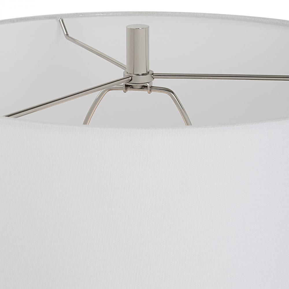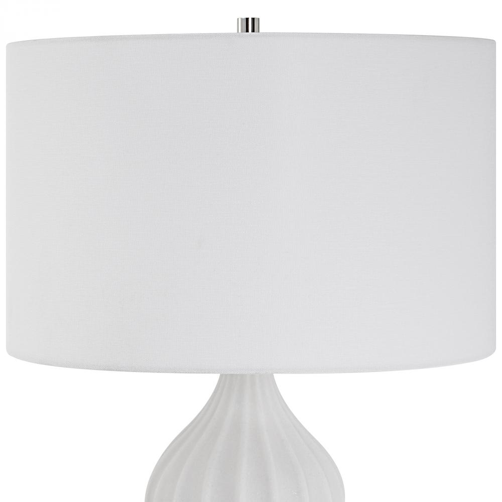 This Table Lamp is Executed in A Rich Ivory Man-made Stone That Accurately Replicates The Look of Thassos Marble Featuring Scalloped Ridges and Polished Nickel Accents. The Round Hardback Shade is Covered in A White Linen Fabric.