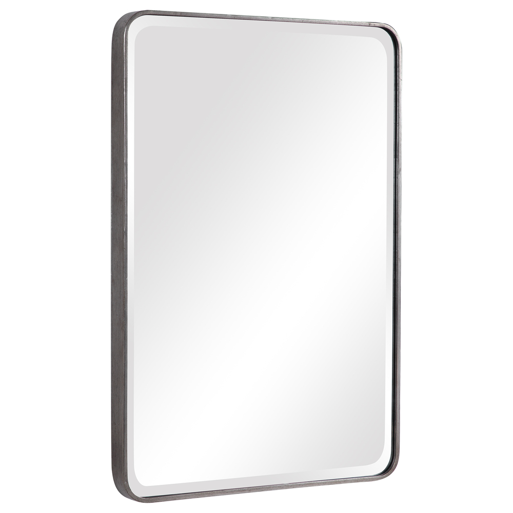This Iron Frame is Finished in Lightly Distressed Silver Leaf Featuring Gracefully Curved Corners, and A Generous 1 1/4" Bevel. May Be Hung Horizontal or Vertical.