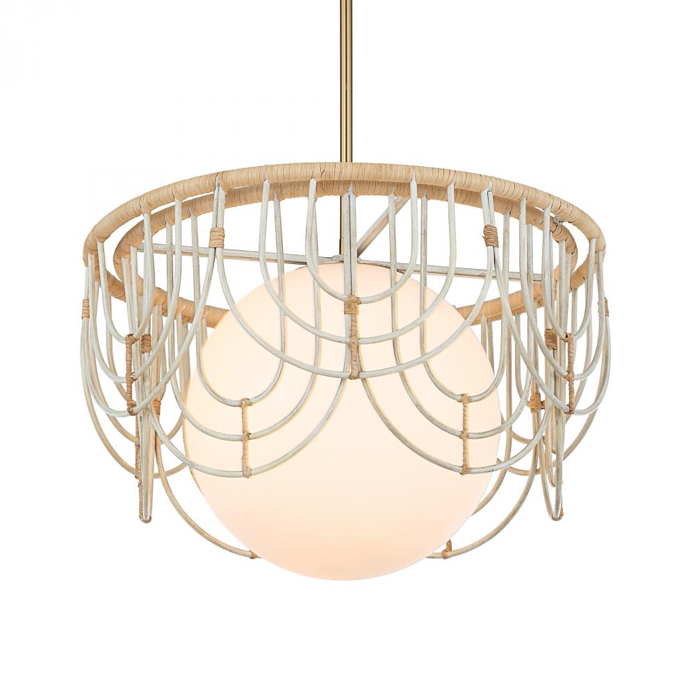 Delicate Arches In Warm White Finish With Natural Rattan Wrapping Give A Nod To 70's Designs With A Large 11" Center Opal Glass Globe All Updated For Today With Antique Brass Accents. 1-60 Watt Max, Edison Socket. Bulb Not Included. Supplied With 15' Wire, 3-12" Stems And 1-6" Stem For Adjustable Installation.