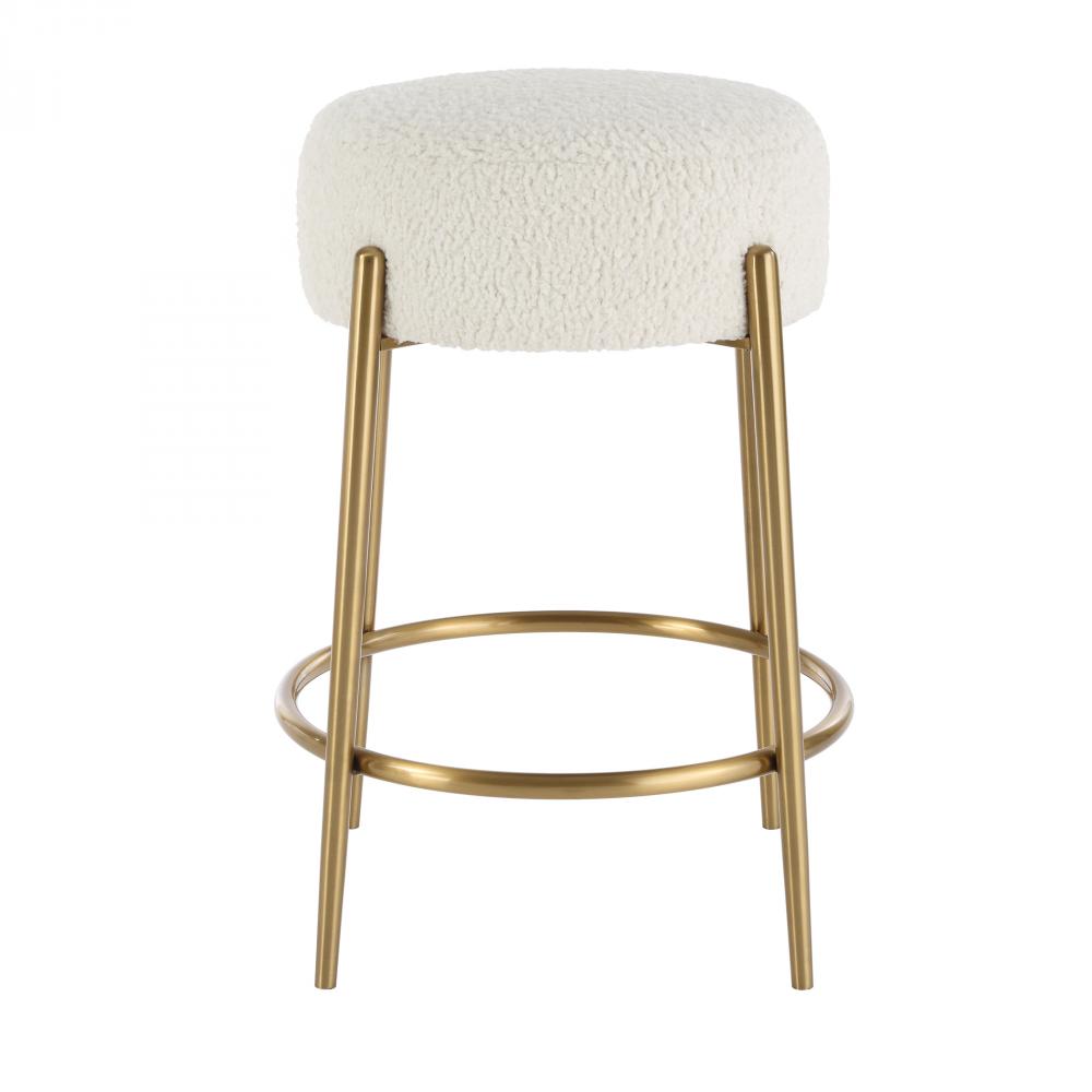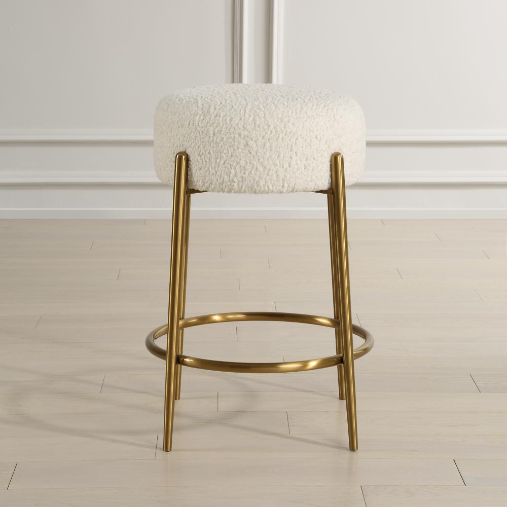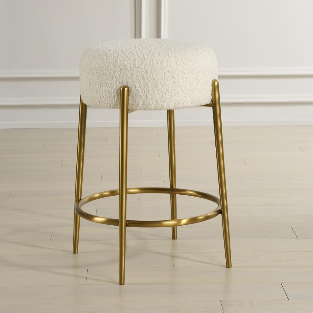 This Plush Counter Stool Is Covered In A Luxurious White Faux Shearling, Suspended Within Brushed Brass Plated Stainless Steel Legs.
