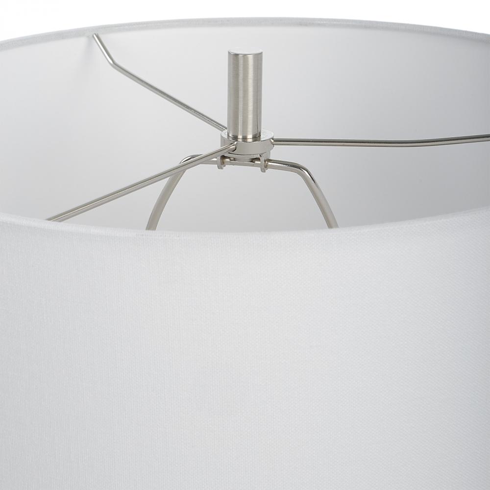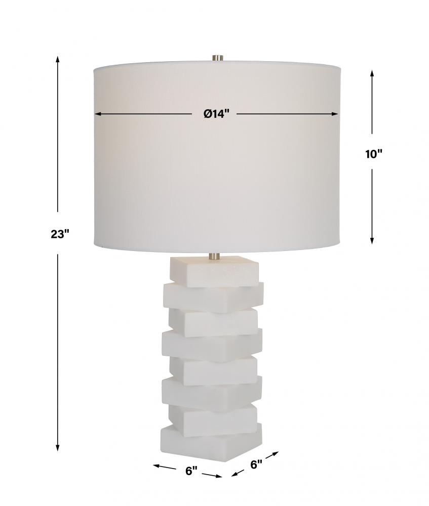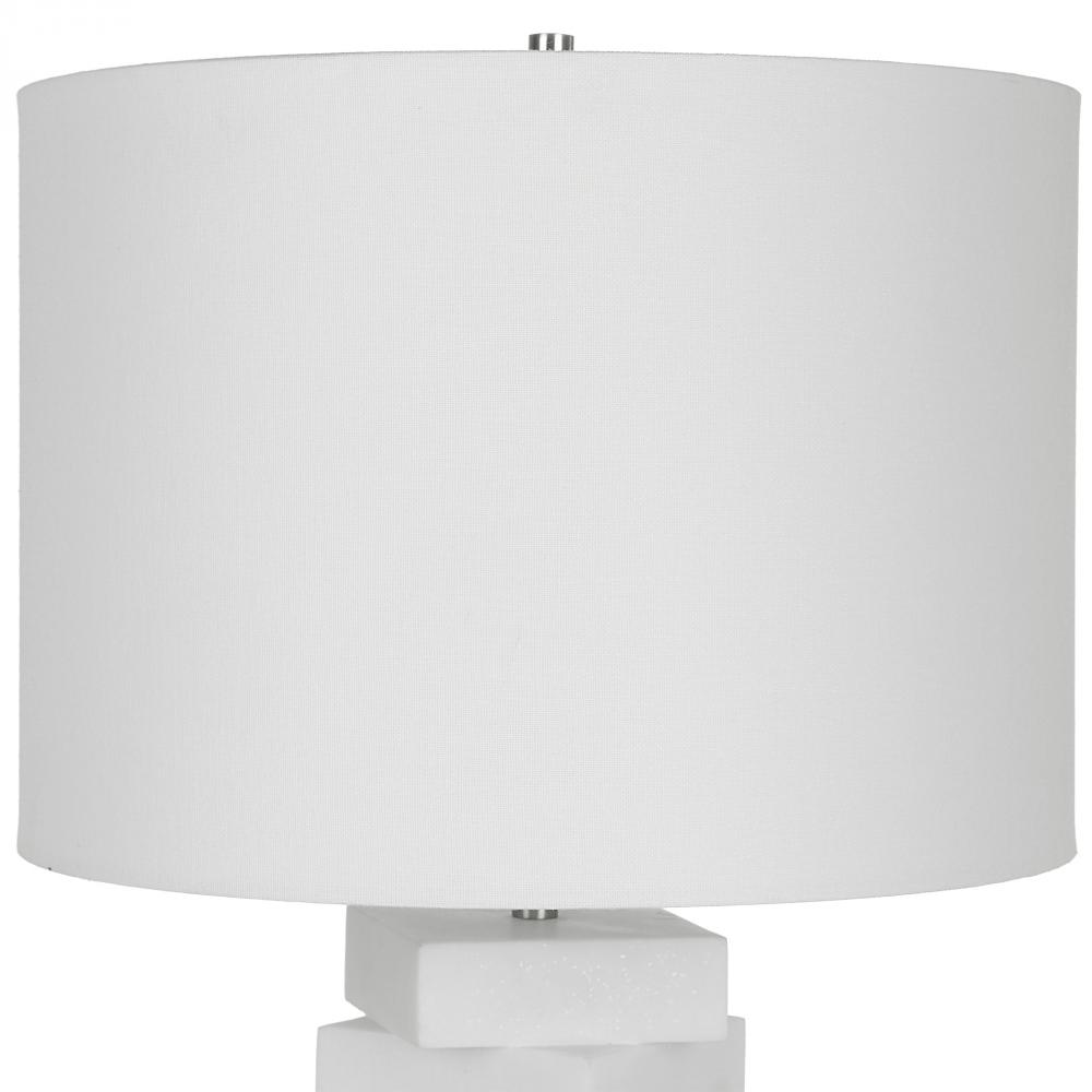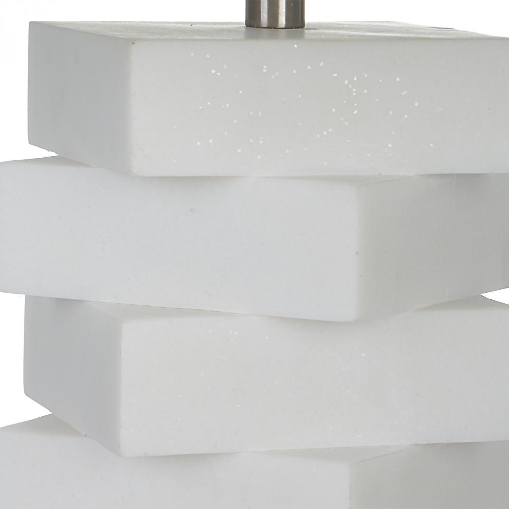 The Ascent Table Lamp Showcases A Unique Geometric Design with Alternating Stacked Blocks Constructed From A Man-made Ivory Stone That Accurately Replicate The Look of Thassos Marble. Iron Details Are Finished in A Plated Brushed Nickel, Paired with A White Hardback Drum Shade.
