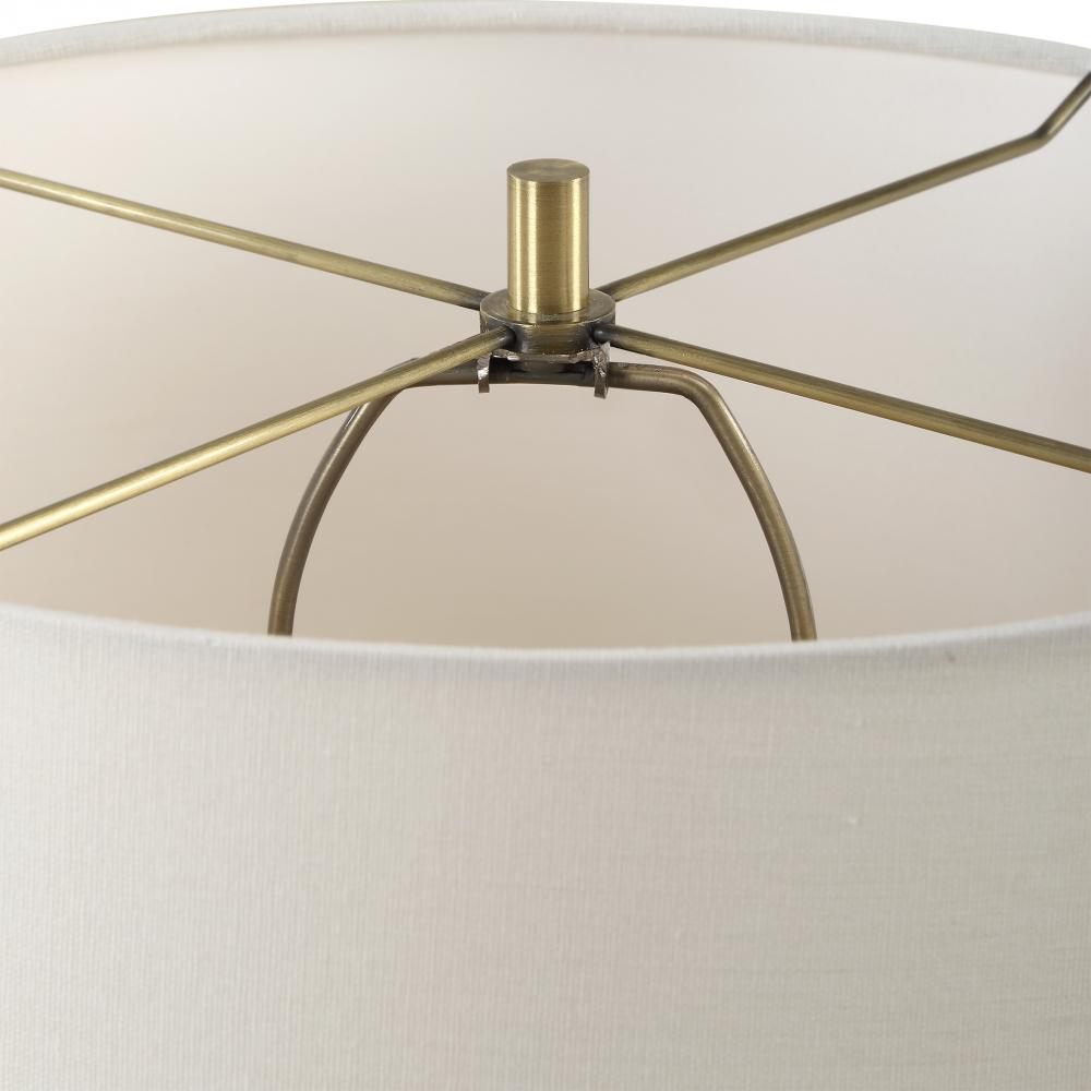 The Aubrey Table Lamp Harmonizes Natural Beauty With Classic Elegance. Crafted From Travertine, Its Base Exudes An Earthy Warmth, While Plated Antique Brass Detailing Adds A Touch Of Refined Sophistication. The Slightly Tapered Round Hardback Shade Is Finished In A Crisp White Linen Fabric.