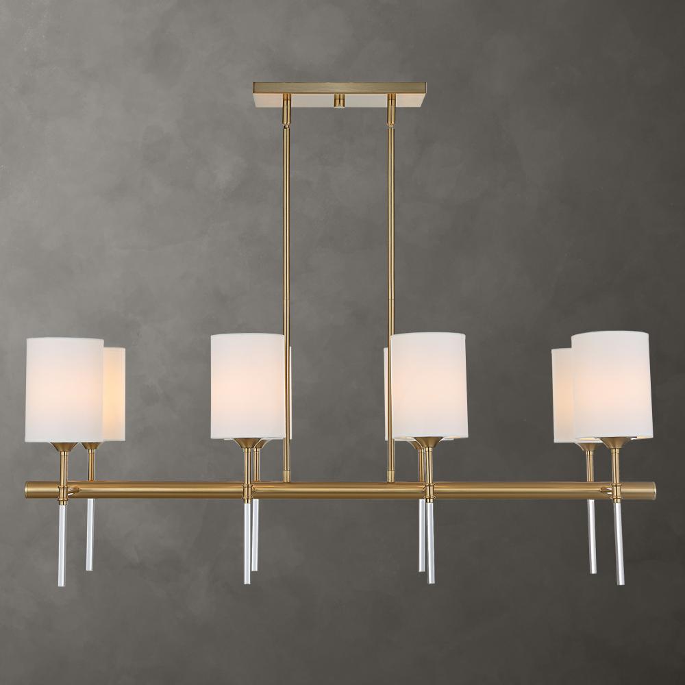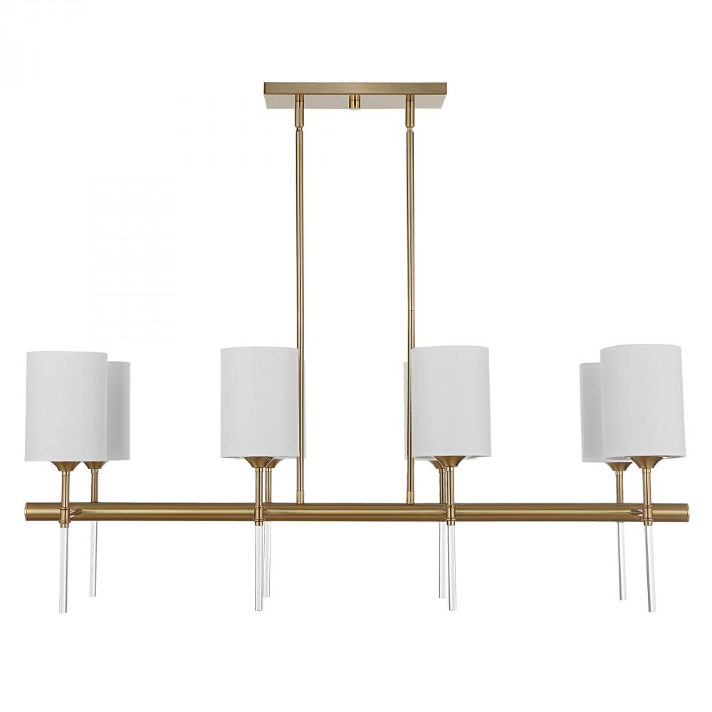 A Traditional 8 Lt Chandelier Elongated To A Linear Shape In A Warm Brass Finish Modernized With A Slender Clear Acrylic Accents With Tall White Silken Shades. 8-60 Watt Max Candelabra Sockets. Bulbs Not Included. Supplied With 20' Wire, 6-12" Stems And 2-6" Stem For Adjustable Installation.