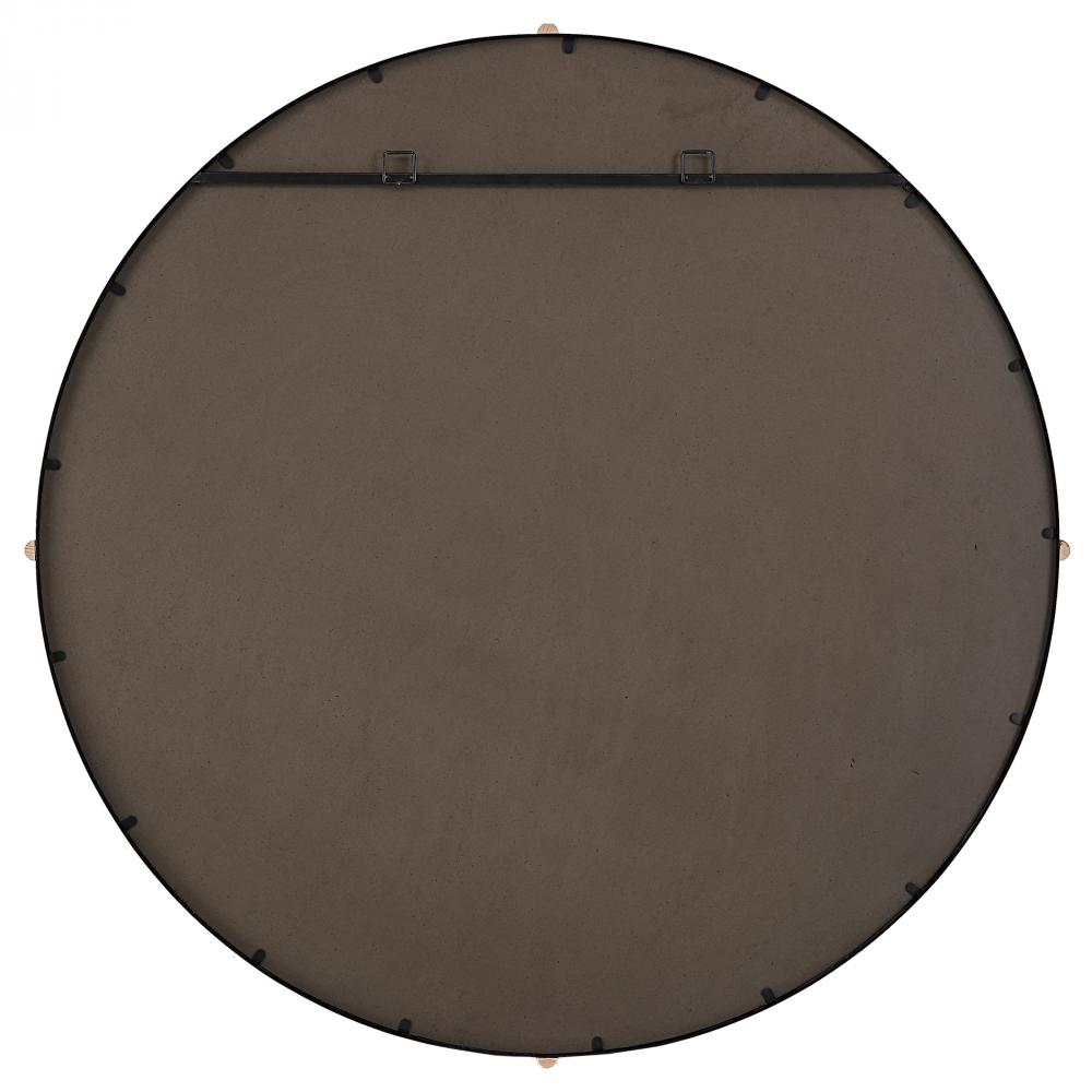 This Large Round Mirror Showcases A Strap Style Iron Frame Finished in A Sleek Matte Black with Soft Curved Ends That Encompass Antique Gold Column Medallions. The Floating Style Mirror Has A Generous 1.25" Bevel.
