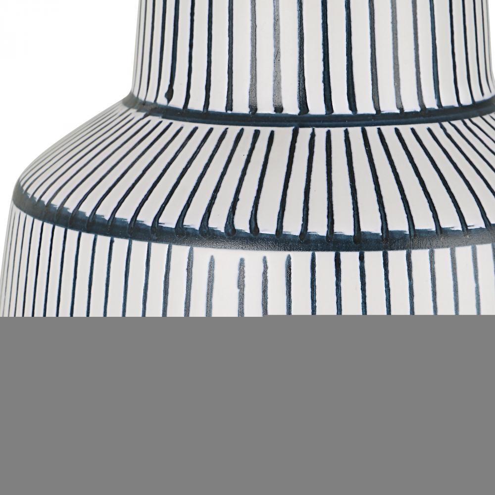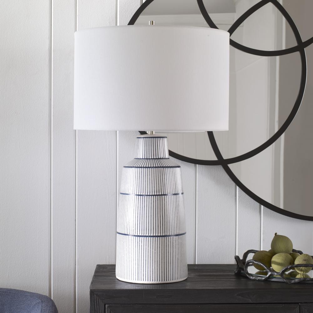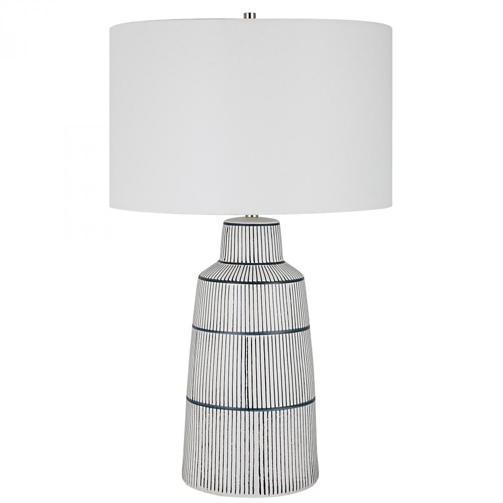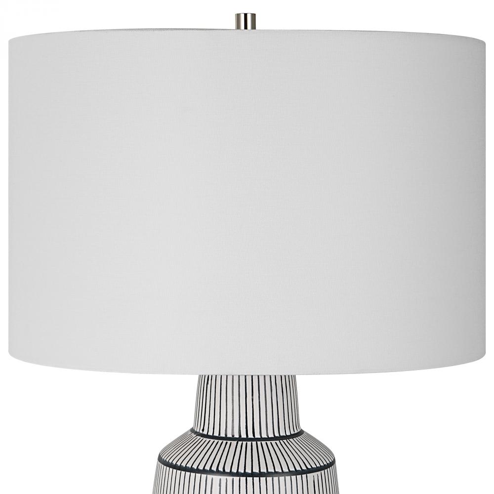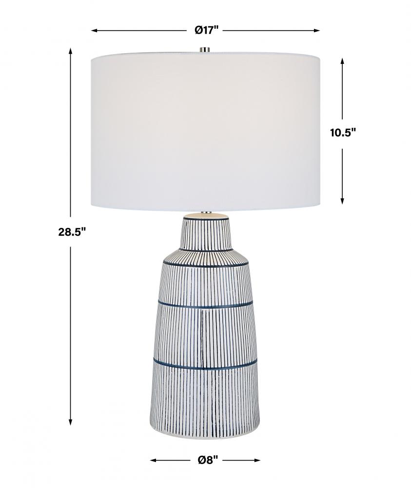 Inspired By The Classic Nautical Stripe Knit, This Ceramic Table Lamp Sports A Satin White Glaze with Rich Navy Blue Stripes and Polished Nickel Plated Accents. The Hardback Drum Shade is Covered in A Crisp White Linen Fabric.