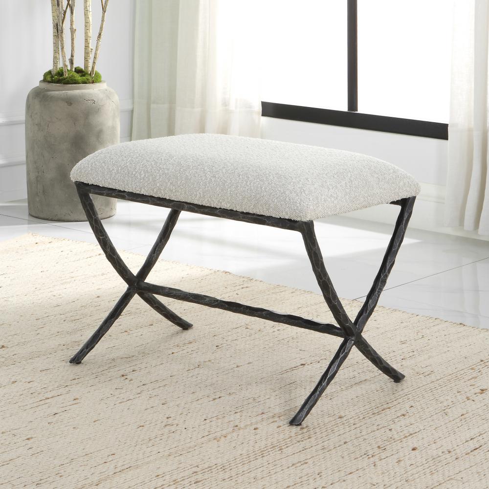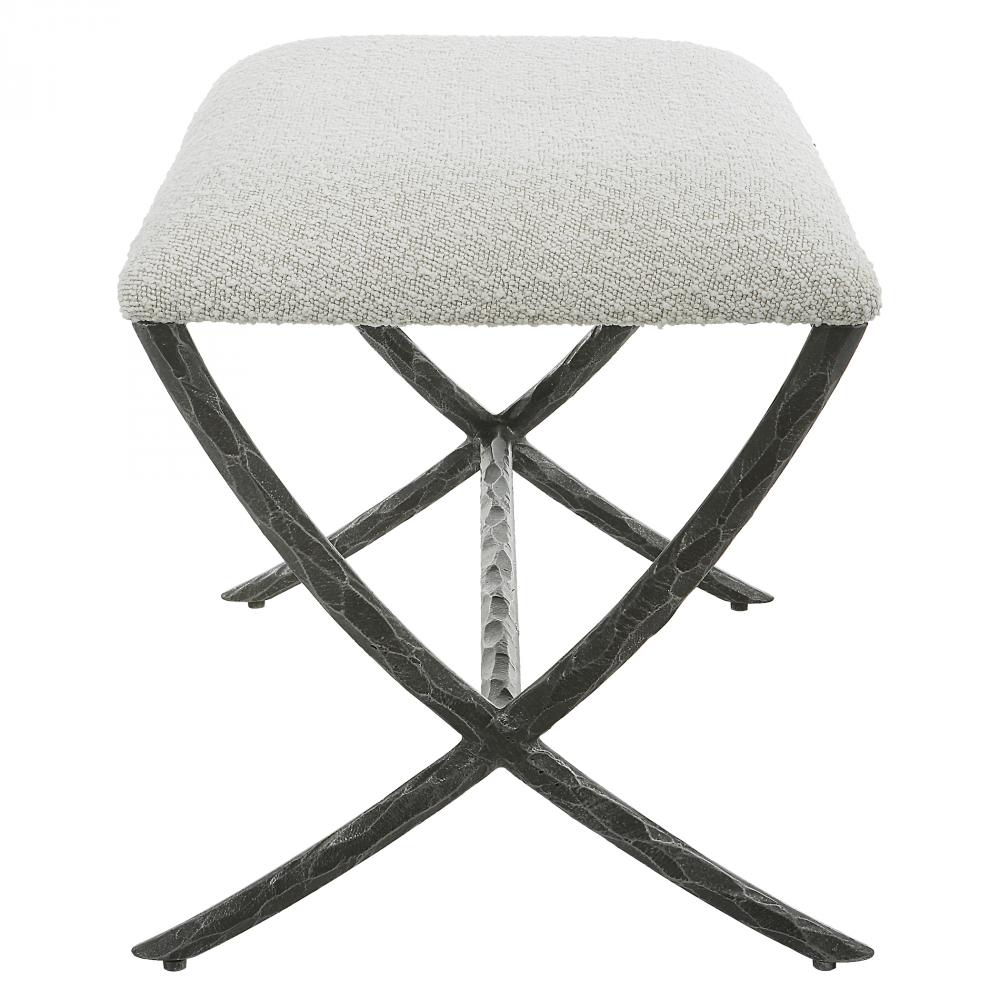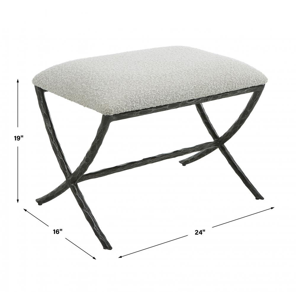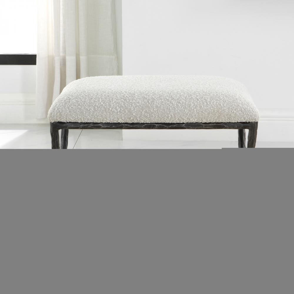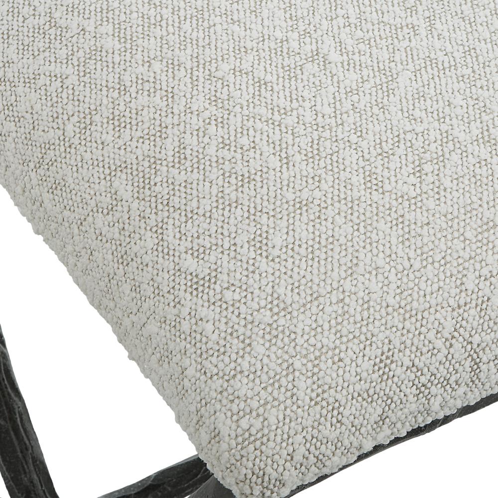 With Clean Contemporary Lines, This Cast Iron Base Features A Chiseled Texturing with A Distressed Charcoal Finish. Topped with An Upholstered Seat in A Casual Ivory and Warm Gray Boucle Fabric.