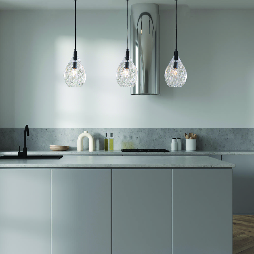 Transitional Pendant in A Matte Black Finish with A Flat Clear Teardrop-shaped Watered Glass. From The Front View, It is A Teardrop Shape and From The Side, It is Only 4" Wide and Flat in Appearance. 1-60 Watt Max Edison Socket. Bulbs Not Included. Supplied with Black 15' Cord and Black Canopy.