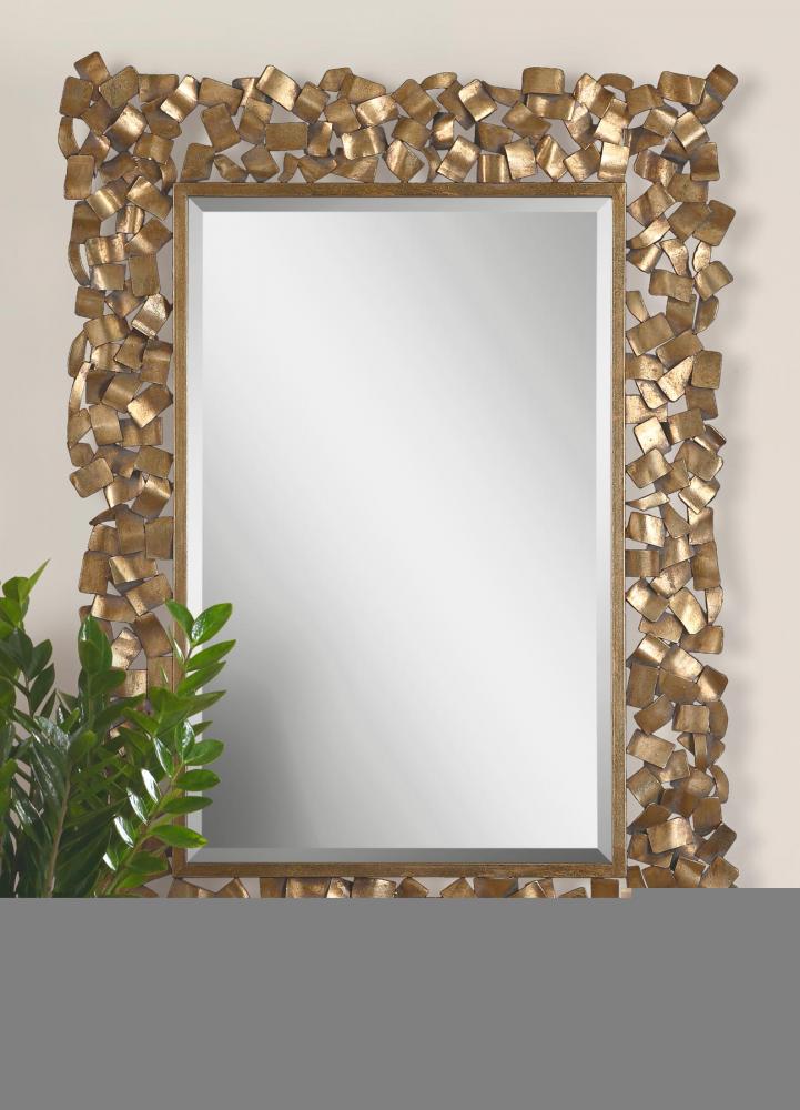 Metal Strips Are Welded Together to Create This Ornate Frame. The Antiqued Gold Leaf Finish Has A Light Gray Glaze. Mirror Has A Generous 1 1/4" Bevel and May Be Hung Horizontal or Vertical.