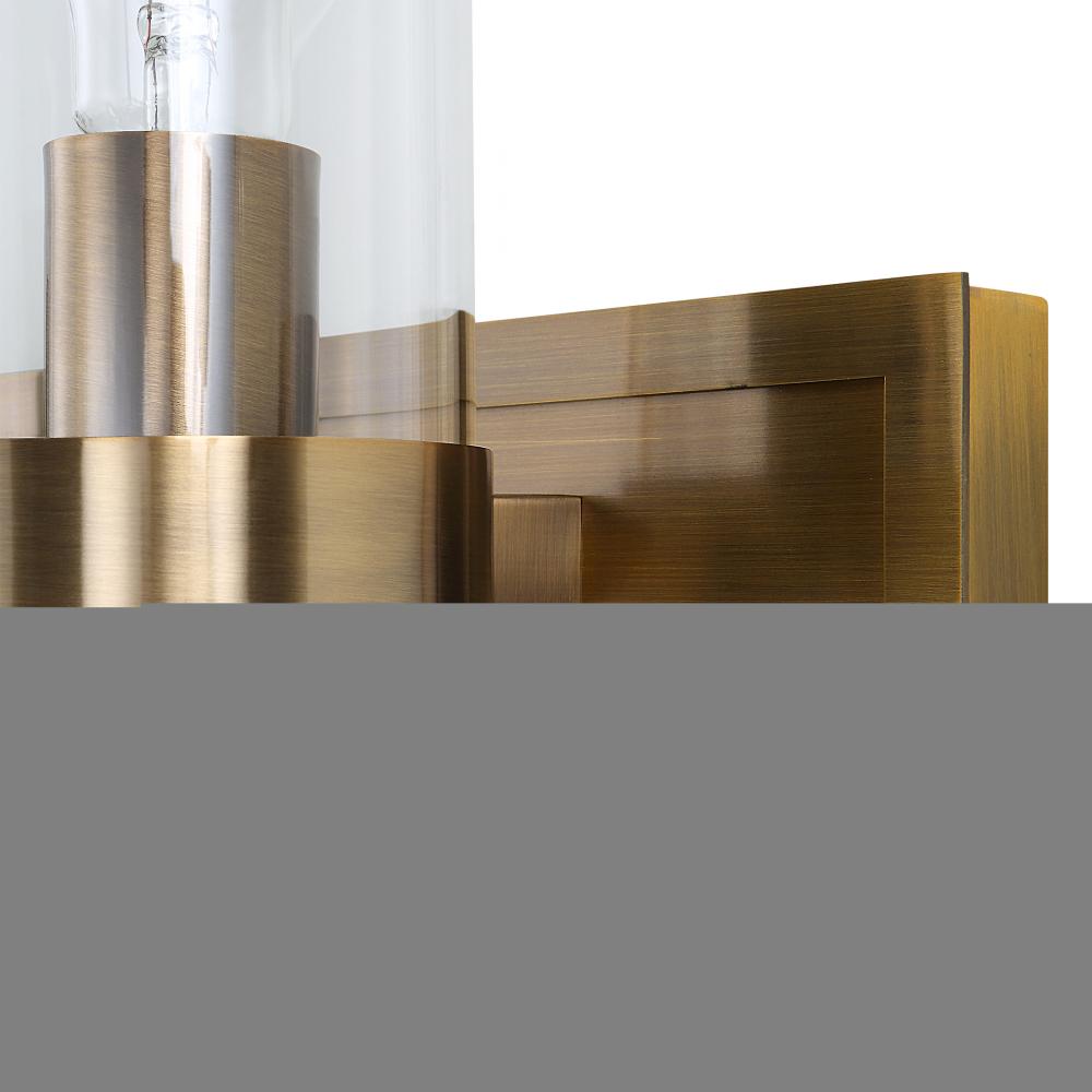 Clean Modern Lines Enhance This 3 Lt. Vanity Featuring A Wide Rings Holding The Clear Cylinder Glass Yielding A Floating Effect, Finished in A Warm Oxidized Antique Brass.3-60 Watt Max, Edison Sockets. Bulbs Not Included.