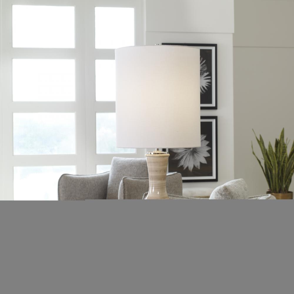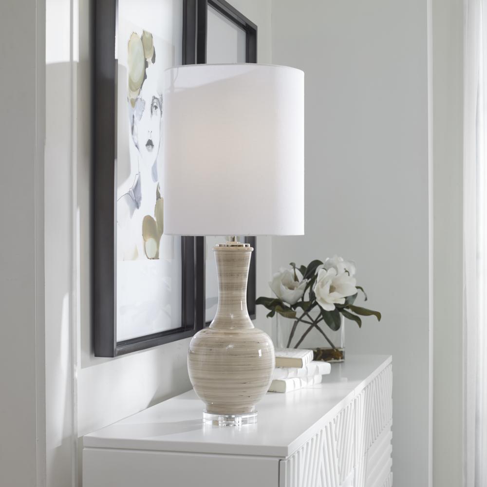 This Table Lamp Showcases A Traditional Curved Silhouette in A Striking Striped Motif. The Ceramic Base Displays Shades of Taupe, Tan, and Charcoal and is Accented By A Thick Crystal Foot with Polished Nickel Plated Details. The Round Hardback Shade is Covered in A White Linen Fabric with Natural Slubbing.
