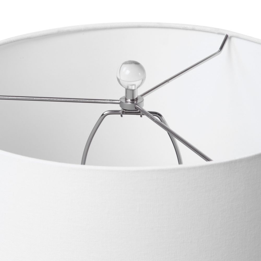 Featuring A Casual Coastal Style, This Table Lamp Showcases Textural, Visual Interest Finished in A Deep Indigo Glaze with Brushed Nickel Accents and A Crystal Finial. The Lamp is Paired with A White Fabric Round Drum Shade.