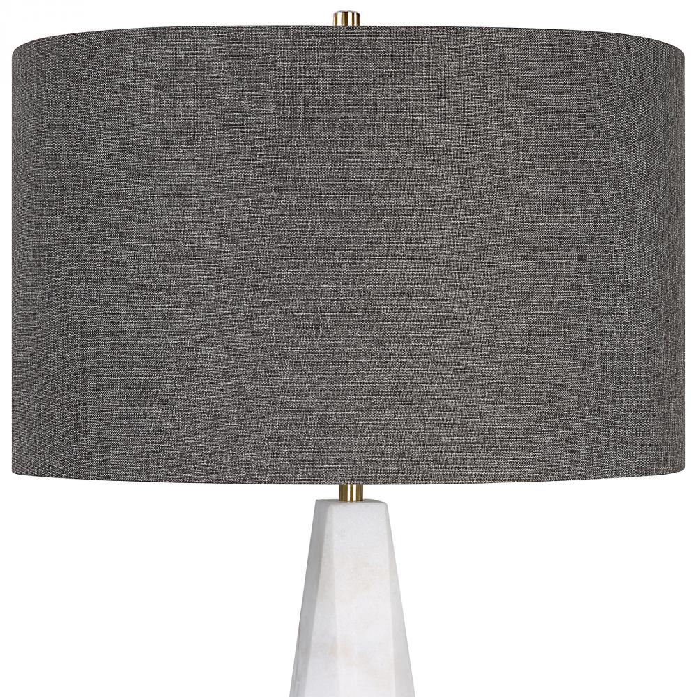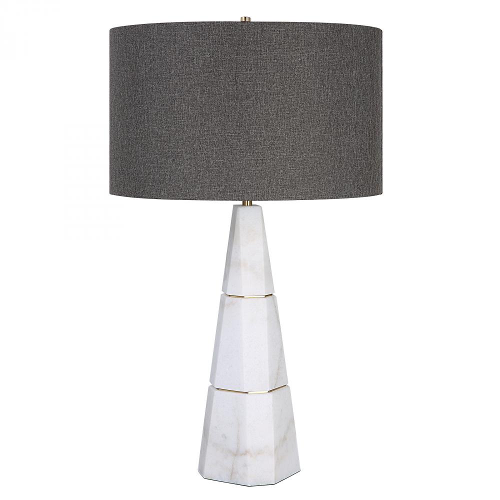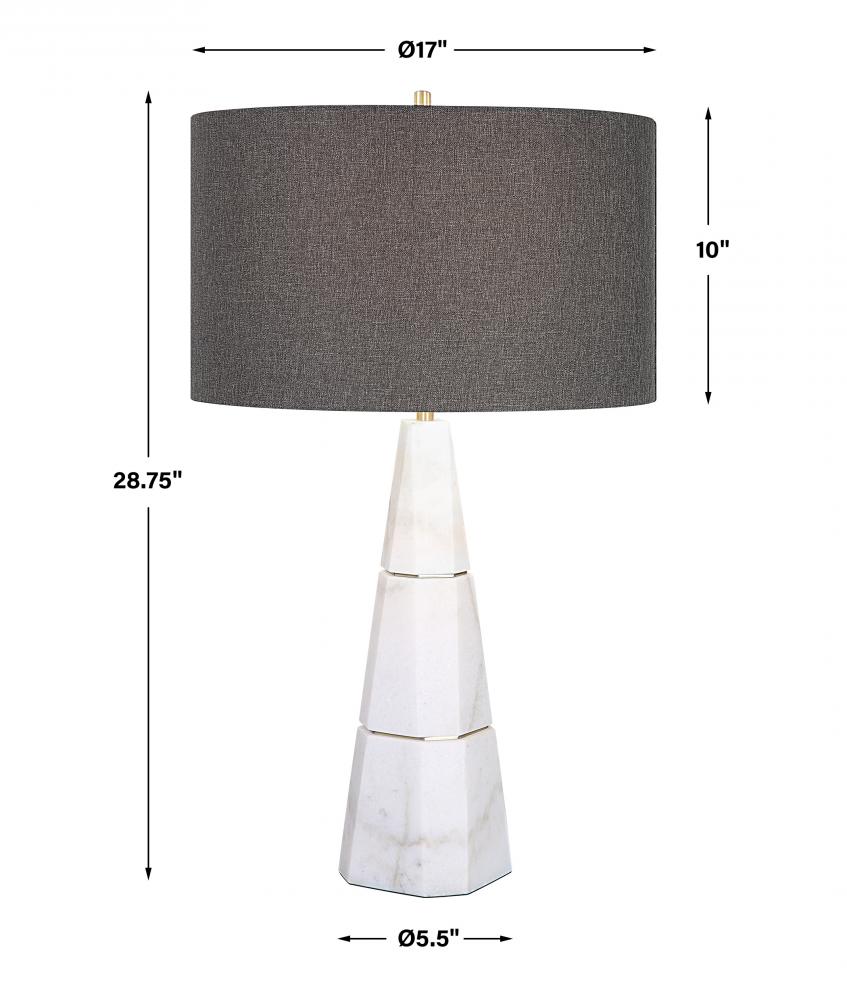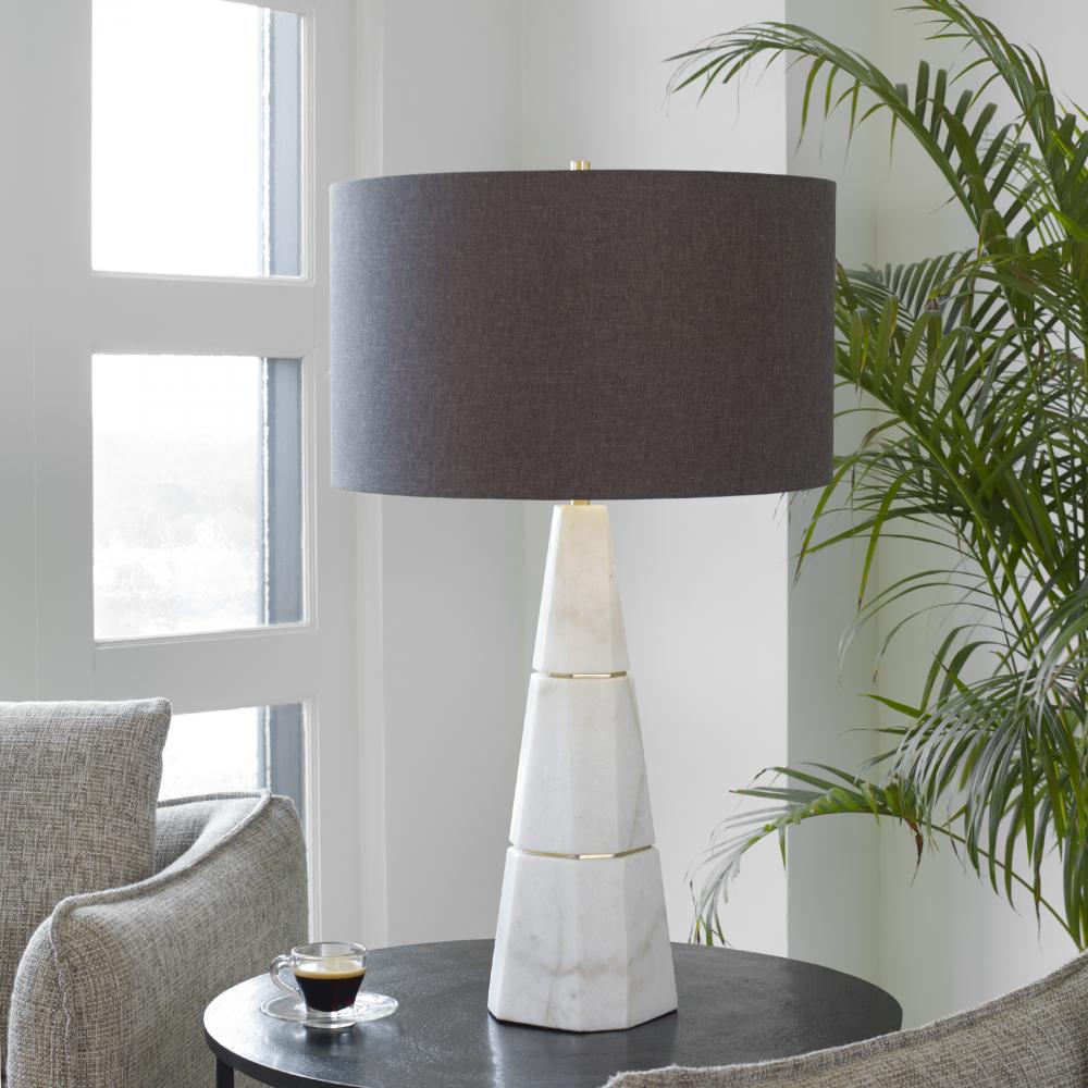 Modern Yet Classic, This Table Lamp Displays An Elegant White Honed Marble Base with Natural Gray Veining and Metal Accents Finished in Antique Brass. A Charcoal Gray Drum Shade Complements The Piece.