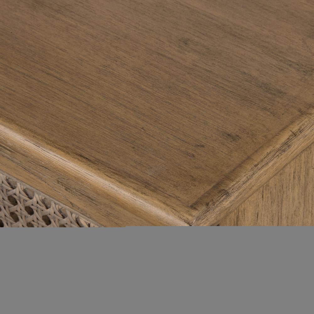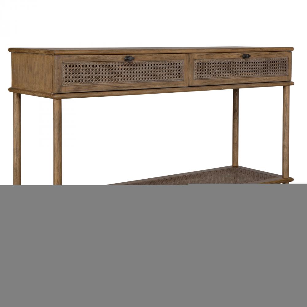 Mid Century Inspired With Accents Of Natural Rattan Cane, This Console Table Features Mindi Solids And Veneers Finished In A Soft Oak Stain. Has One Storage Shelf And Two Drawers With Metal Hardware In Dark Gunmetal.