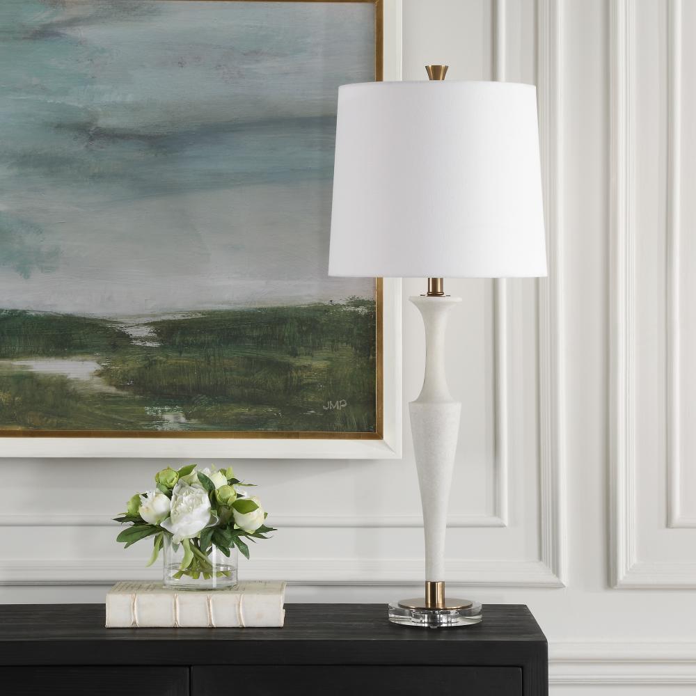 This Table Lamp Adds An Air Of Elegance And Sophistication To Any Space. The Base Of The Lamp Is Crafted From Ivory Man-made Stone That Accurately Replicates The Look Of Thassos Marble And Is Accented By Plated Antique Brass Details, Displayed On A Crystal Foot. The Tapered Round Hardback Shade Is Covered In A White Linen Fabric.