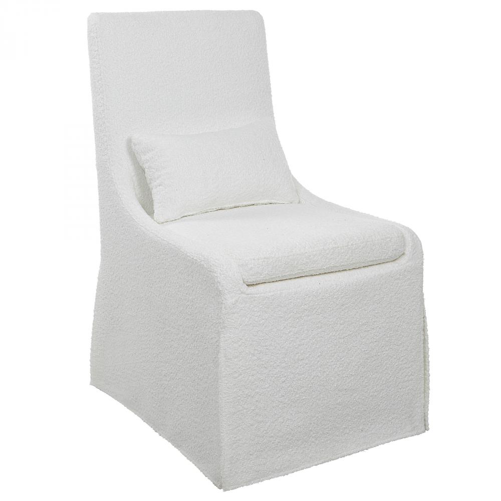 Simplistic in Form, This Sophisticated Armless Chair Features A Heavily Textured Polyester Slipcover in Crisp White with A Plush Cushion Seat and Kidney Pillow for Extra Comfort. Has Added Performance Treatment to Resist Soiling and Stains. Seat Height is 20". Dry Clean Only.