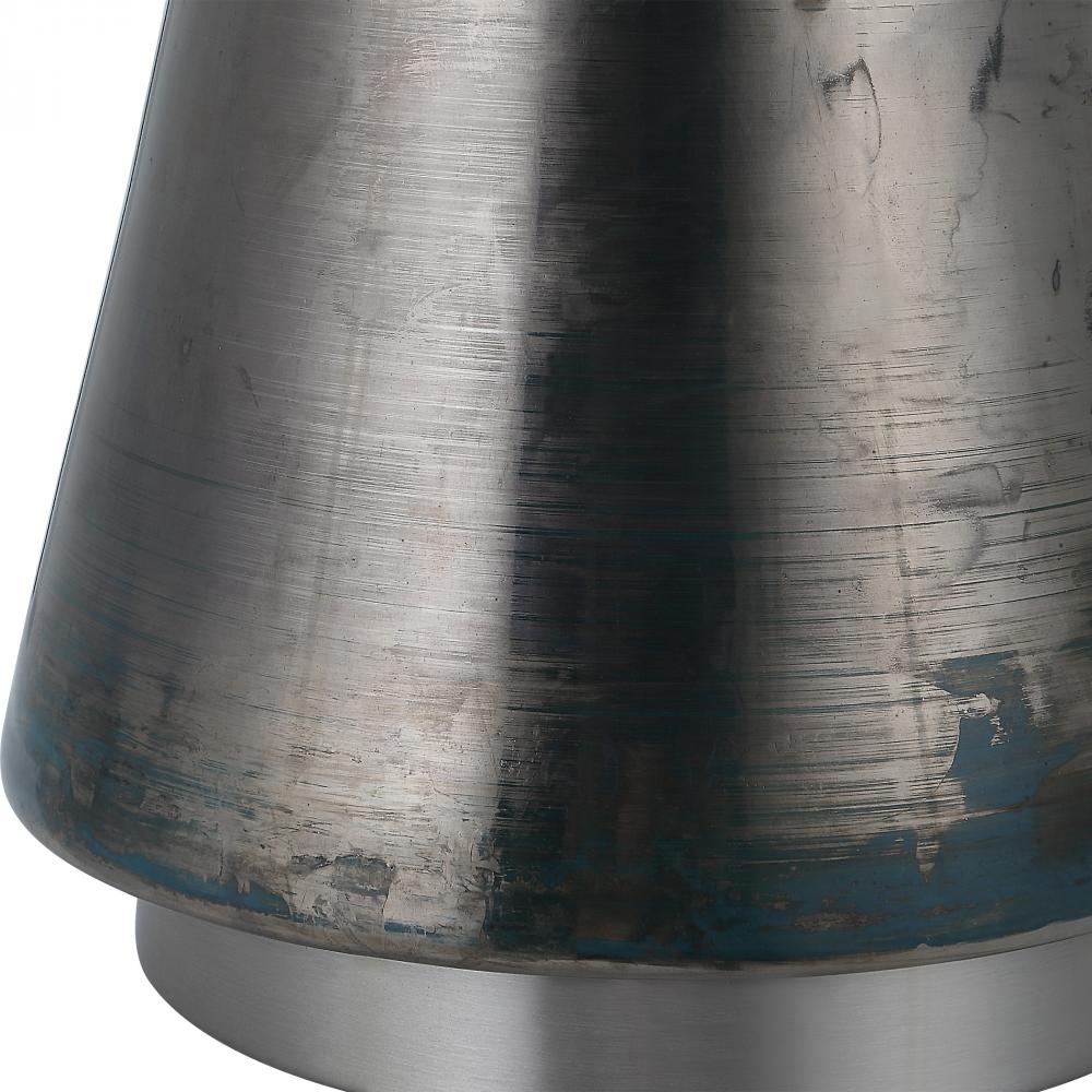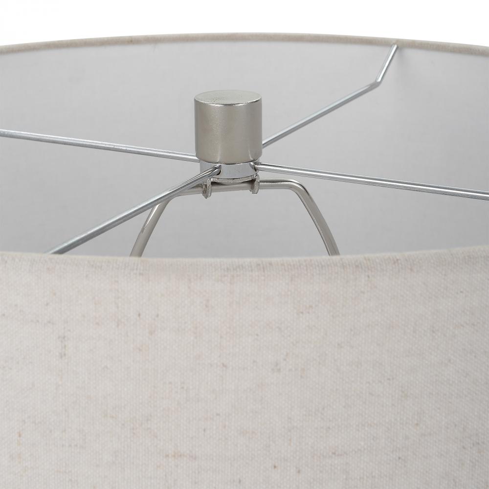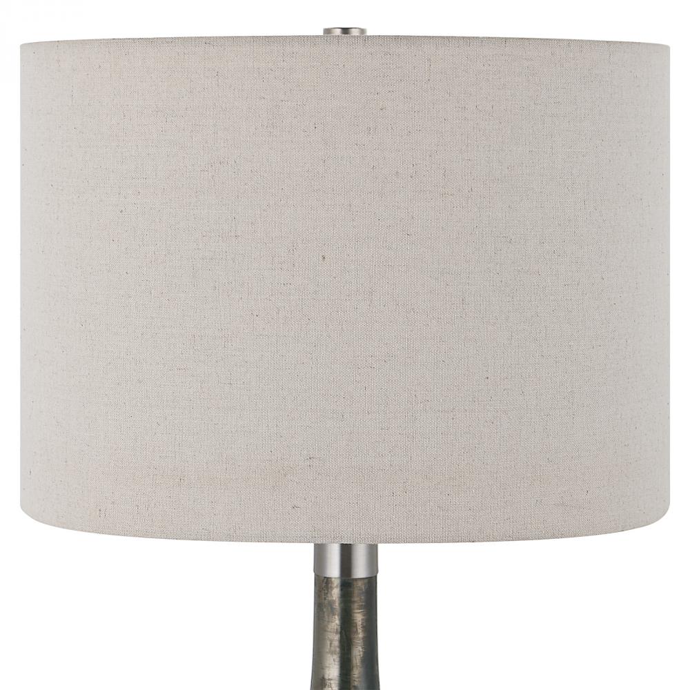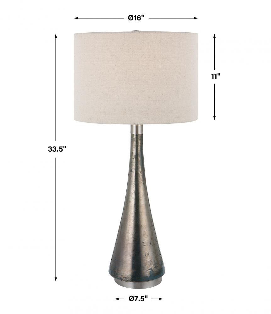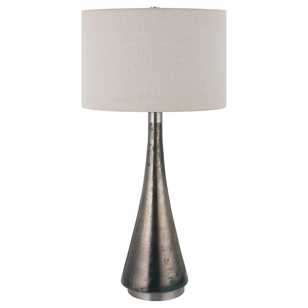 This Table Lamp Features A Graceful Tapered Base Crafted From Artisanal Blue-green Metallic Glass. Iron Accents Are Finished in Brushed Nickel. The Drum Shade is Covered in A Light Oatmeal Fabric with Natural Slubbing.