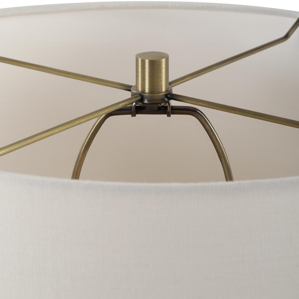 Featuring An Unfilled Honed Travertine Base Paired With Sophisticated Plated Antique Brass Accents. This Piece Combines Natural Beauty With A Touch Of Luxury, Making It A Perfect Addition To Any Decor Seeking A Balance Of Earthiness And Refinement. A Round Hardback Drum Shade Made With A Crisp White Linen Fabric Completes The Piece.