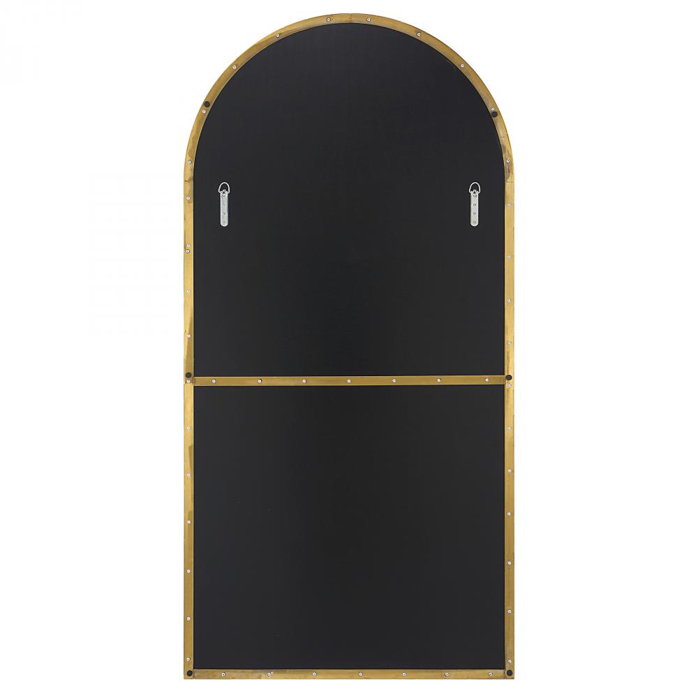 This Oversized Arch Features A Sleek Stainless Steel Frame Finished in A Rich Antique Brass Surrounding A Floating, Polished Edged Mirror.
