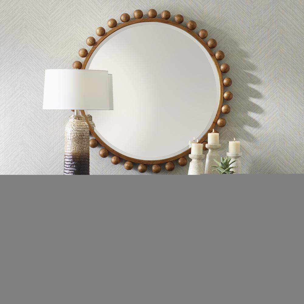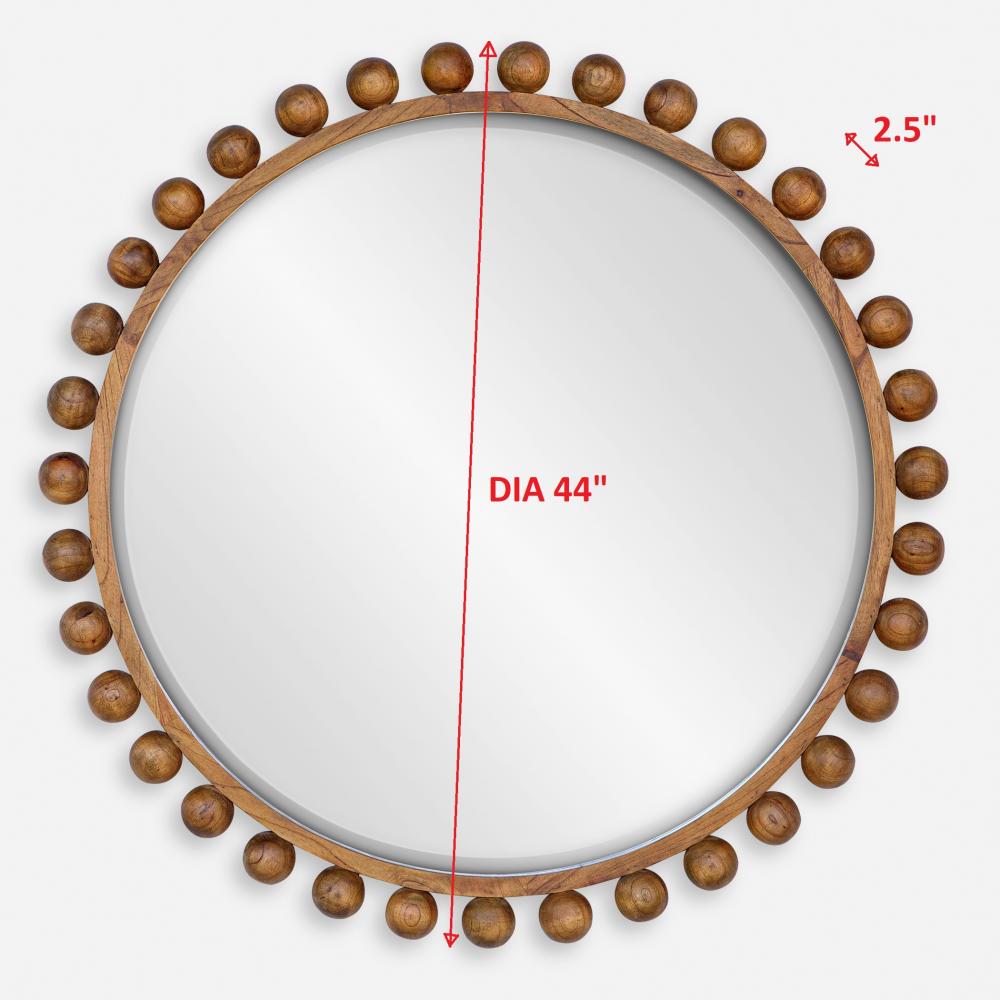 The Cyra Wood Round Mirror Adds An Upscale Look and Sophisticated Style to Any Room By Showcasing Solid Mahogany Wood Spheres That Embellish A Sleek Inner Frame, Finished in A Warm Walnut Stain.