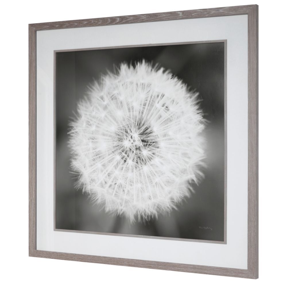 This Black and White Dandelion Framed Print is A Great Neutral Piece of Artwork That Adds Interest to Any Space. The Print is Accented By A Driftwood Gray Pine Wood Frame with A Matching Fillet and A Large White Mat. Artwork By Majchrowicz.