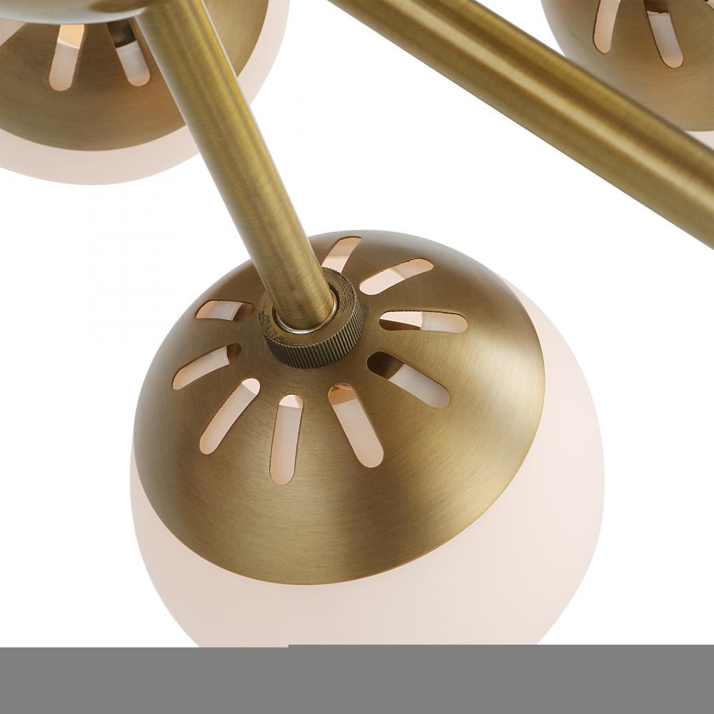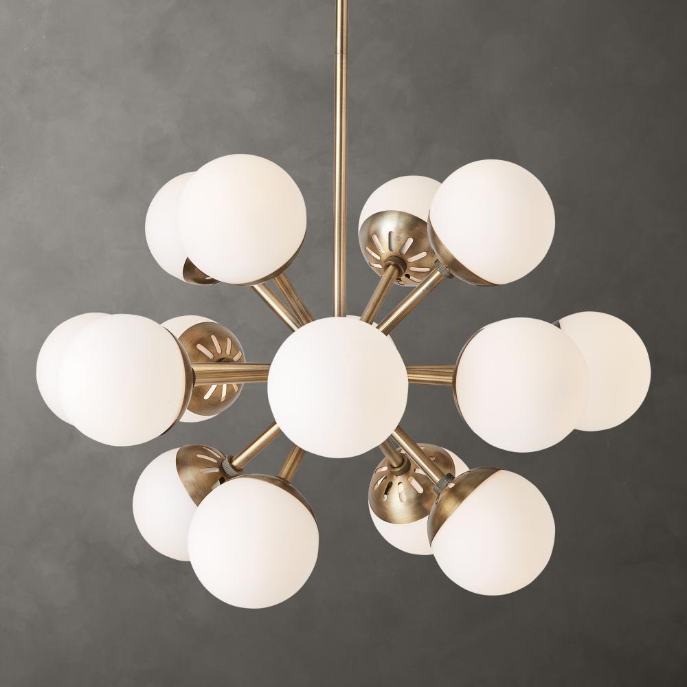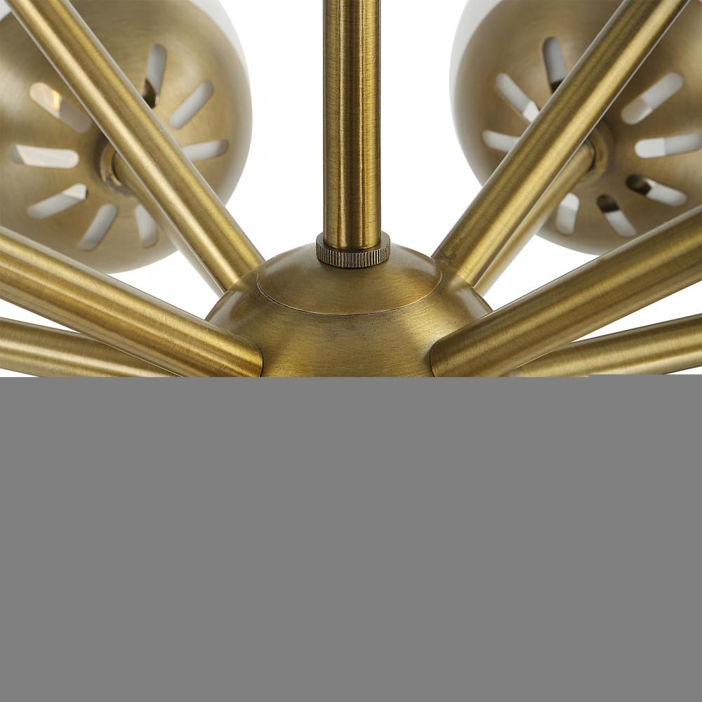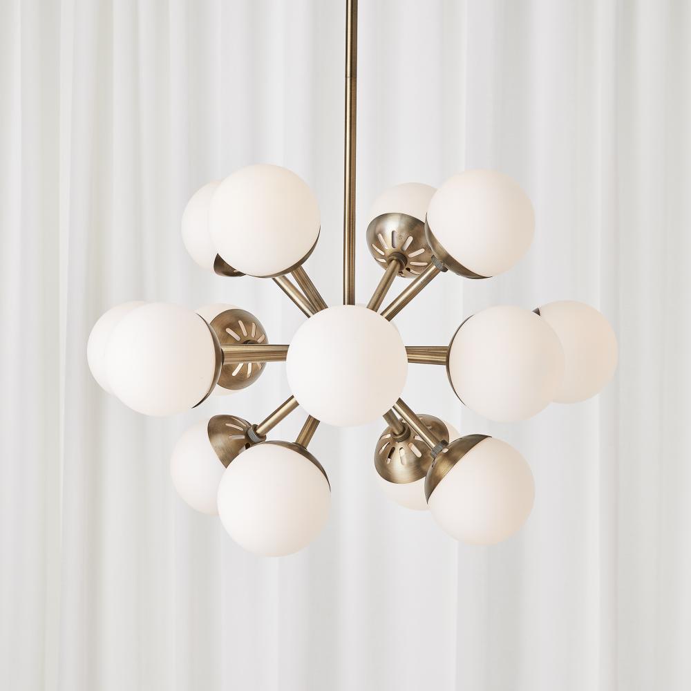 Designed with Mid-Century Roots A Sputnik Center Structure Finished in A Warm Antique Brass and Accented with 5" Matte White Opal Globes Yields A Modern Take on Vintage Style. 16-60 Watt Max G16.5 Candelabra Sockets. Bulbs Not Included. Supplied with 15' Wire, 3-12" Stems and 1-6" Stem for Adjustable Installation.