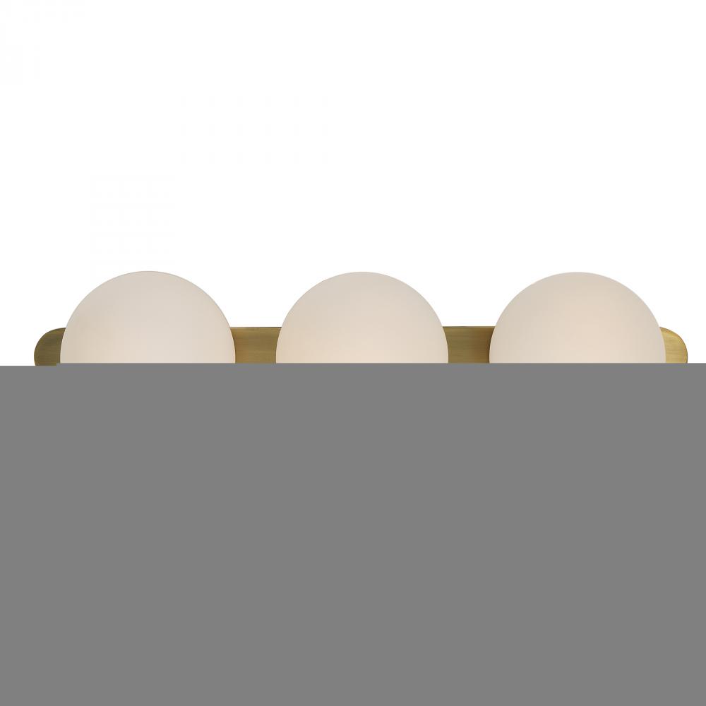 A 3 Light Sconce Designed with Mid-Century Roots Finished in A Warm Antique Brass and Accented with 5" Matte White Opal Globes Yields A Modern Take on Vintage Style. Can Be Hung Horizontal or Vertical and Can Be Used in Bath Vanity Locations. 3-60 Watt Max, Candelabra Sockets. Bulbs Not Included.
