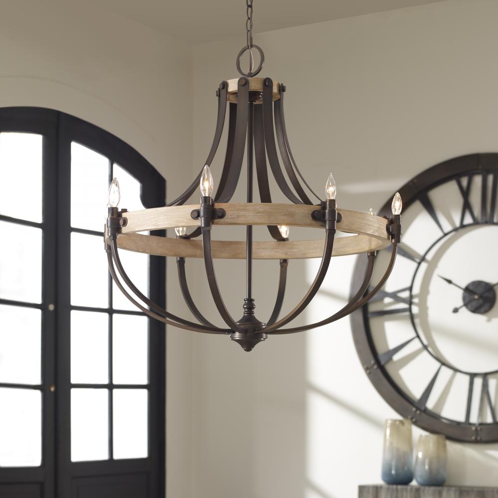 Updated Empire Shaped 8 Lt. Chandelier with A French Influence, Featuring A Ring of Natural Oak A Bronze Metal Frame. 8-60 Watt Max, Candelabra Sockets. Bulbs Not Included. Supplied with 20' Wire and 7' Chain for Adjustable Installation.