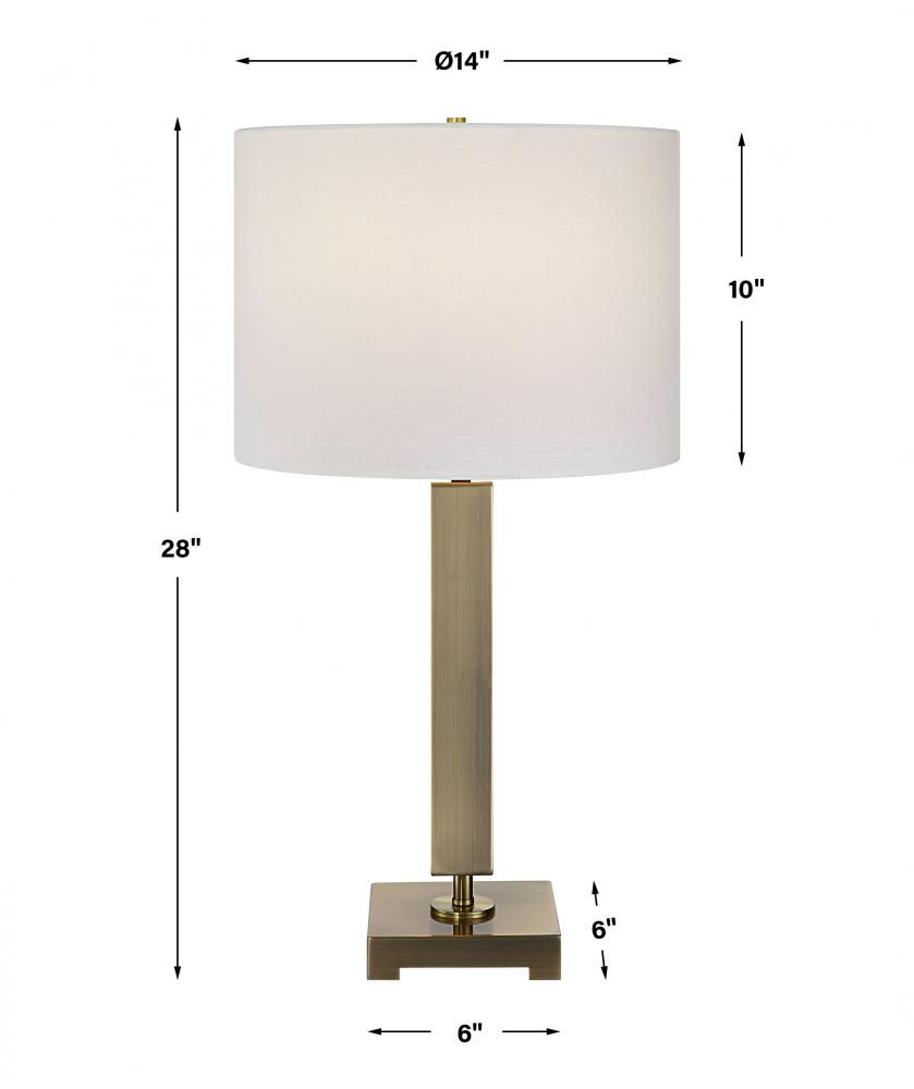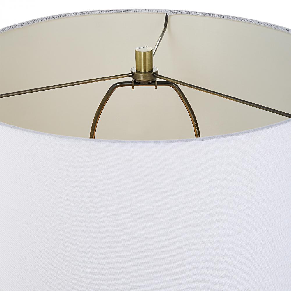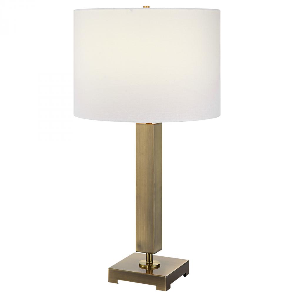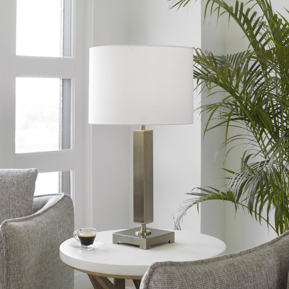 This Sophisticated Table Lamp Showcases A Streamlined Metal Column Base Finished in Antique Brass. The Round Hardback Shade is Covered in White Linen Fabric.