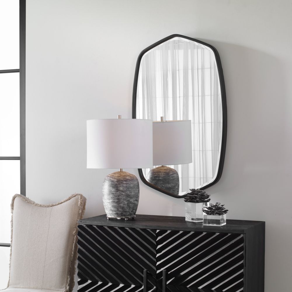 This Hand Forged Iron Mirror Frame Features A Unique Shape with Elegant Curves, Finished in A Streamlined Satin Black. Mirror Has A Generous 1 1/4" Bevel.