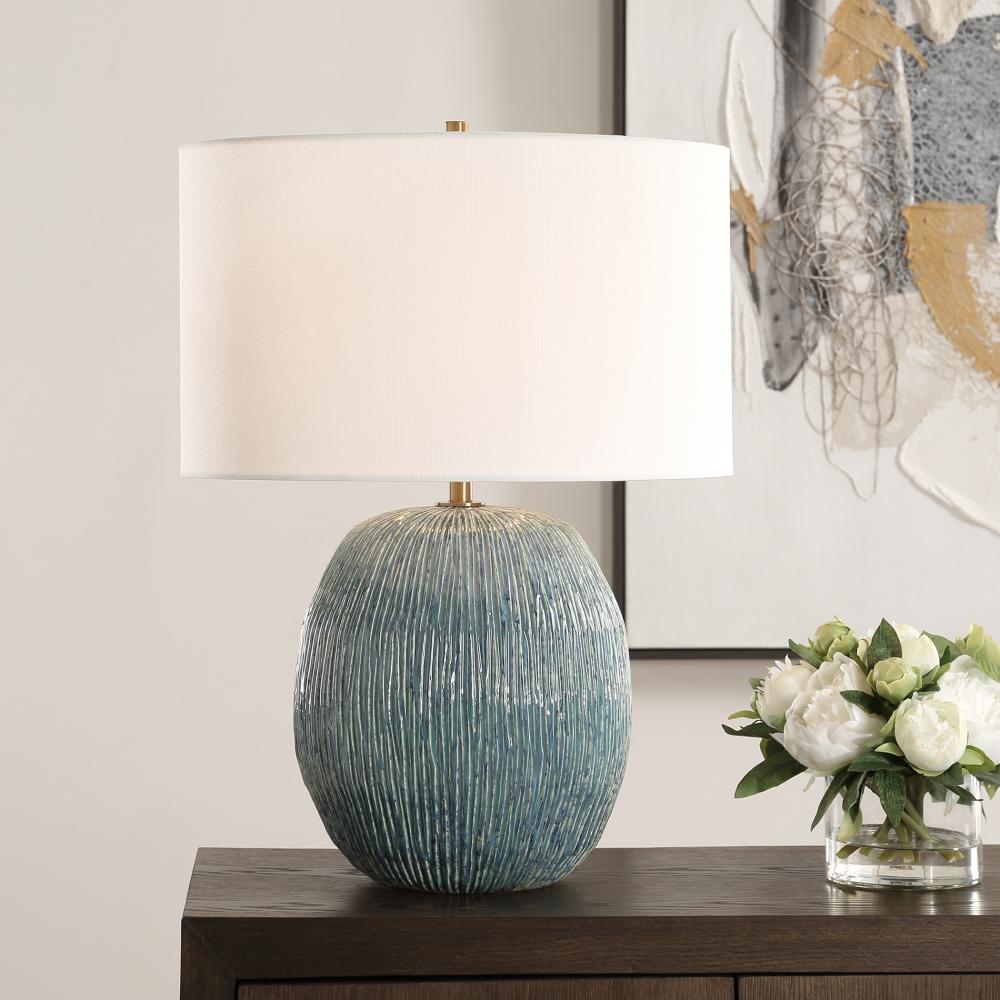 This Ceramic Table Lamp Features An Interesting Organic Texture Of Vertical Cuts. The Reactive Glaze Naturally Creates A Dynamic Layering Of Different Levels Of Beautiful Blues, Greens, And Creams, Paired With Antique Brass Plated Details. A Round Hardback Drum Shade Made With A Casual White Linen Fabric Completes The Piece. Due To The Nature Of Fired Glazes On Ceramic Lamps, Finishes Will Vary Slightly.