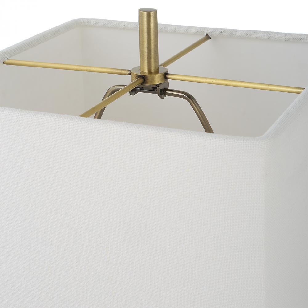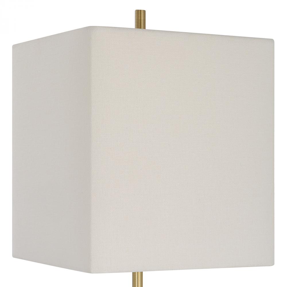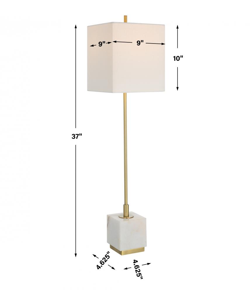This Versatile Buffet Lamp Showcases A Slim Plated Brushed Brass Metal Base Accented By A Large White Marble Block Foot with Natural Veining. The Square Hardback Shade is Covered in A Slubbed White Linen Fabric.