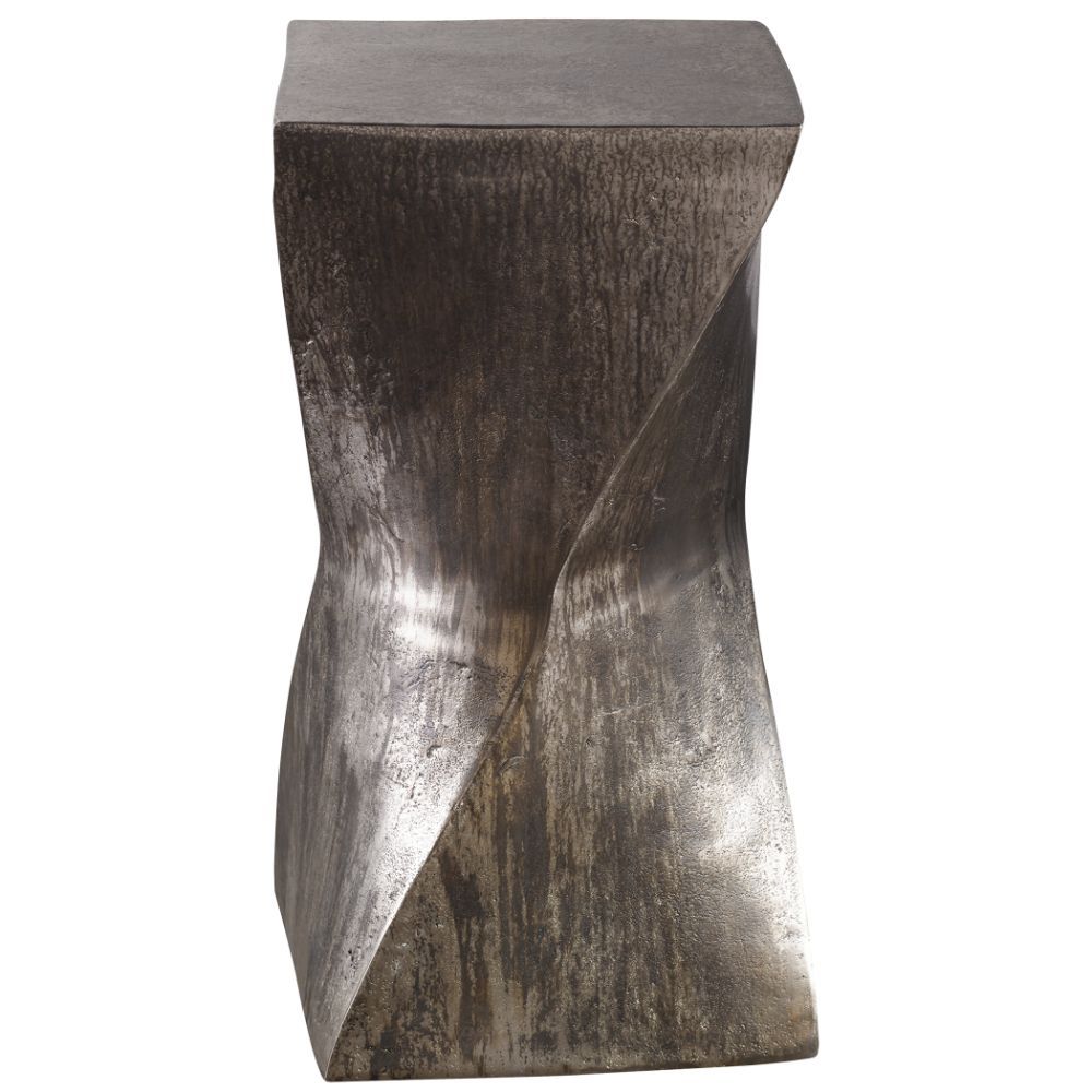 Featuring A Unique Twisted Hourglass Shape, This Cast Textured Aluminum Table is Finished in A Heavily Tarnished Silver with Oxidized Distressing Details.
