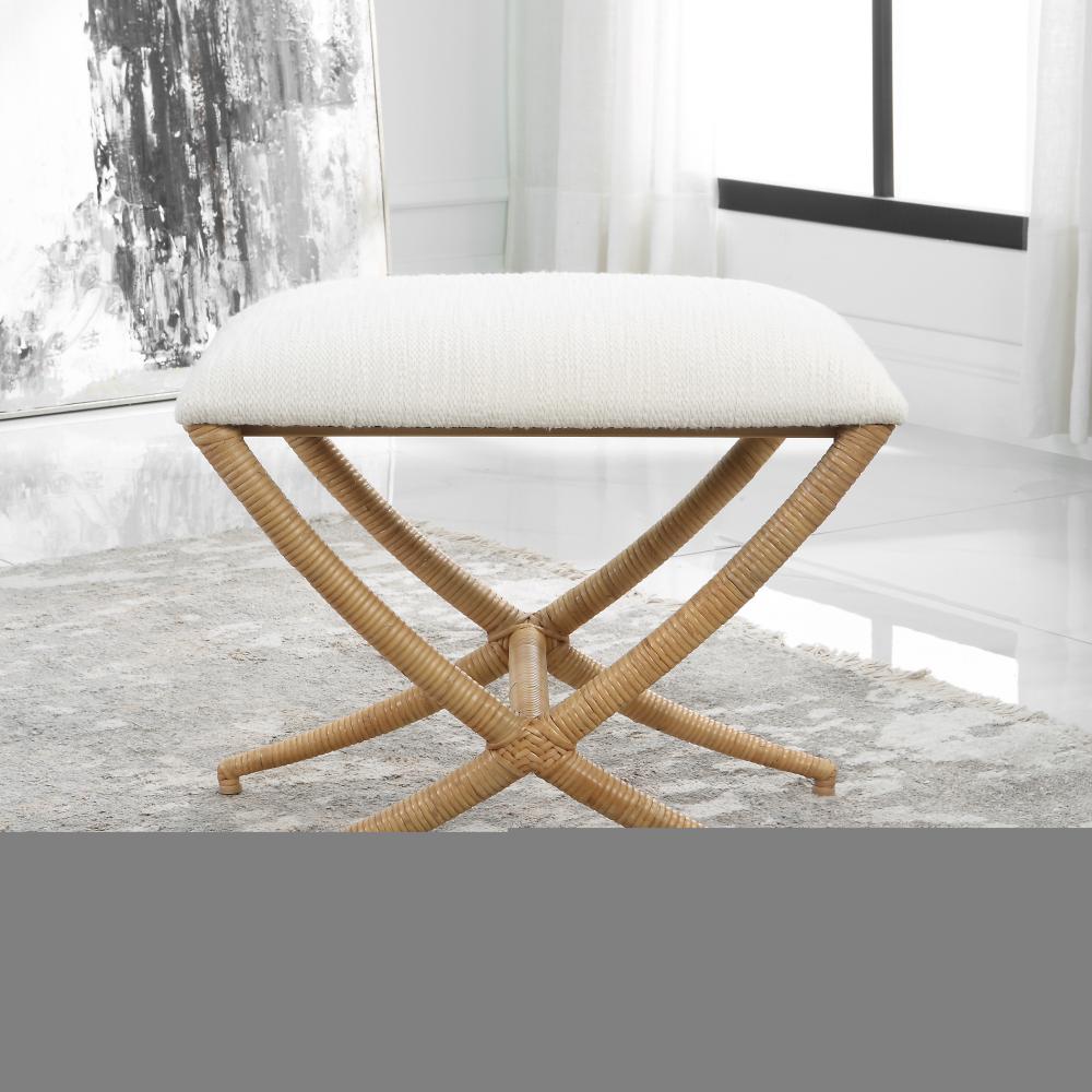 The Perfect Casual Accent, The Expedition Small Bench Displays Coastal Influence with A Natural Rattan Wrapped Iron Base. The Cushioned Seat is Upholstered in A Crisp White Textured Polyester Fabric.