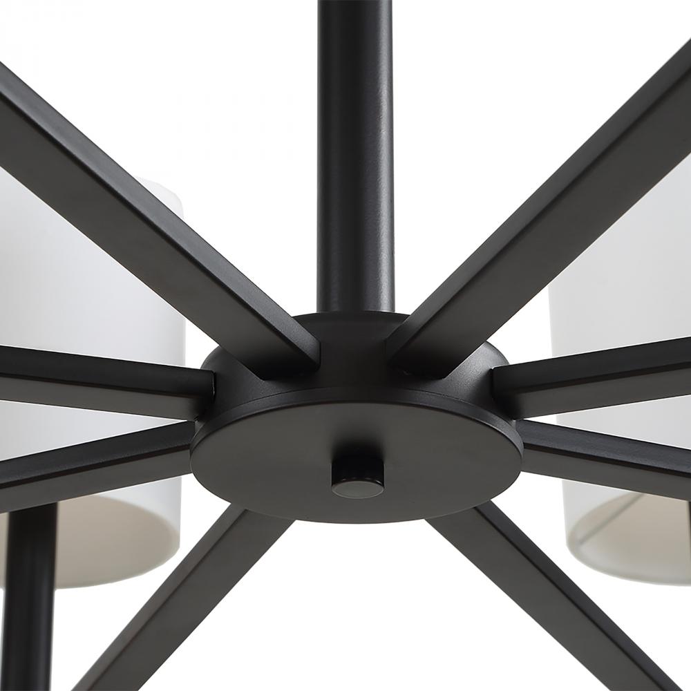 Several Design Looks Come Together In This Warm Transitional Eight Light Chandelier Featuring A Natural Ring Of Woven Rattan Enhanced With A Rich Dark Bronze Finish. Softening The Look Each Arm Is Topped With A Round Hardback White Linen Shade. 8-60 Watt Max Candelabra Sockets. Bulbs Not Included. Supplied With 20' Wire, 3-12" Stems And 2-6" Stem For Adjustable Installation.