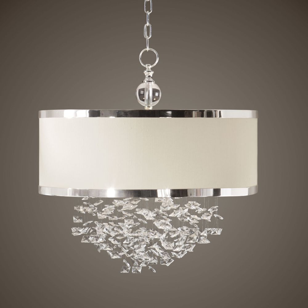 The Classic Appeal of Crystal is Updated for Today's Sophisticated Tastes, with Free-falling Crystals and A Silver-trimmed, Antique White Linen Drum Shade. 3-100 Watt Max, Edison Sockets. Bulbs Not Included. Supplied with 15' Wire and 7' Chain for Adjustable Installation.