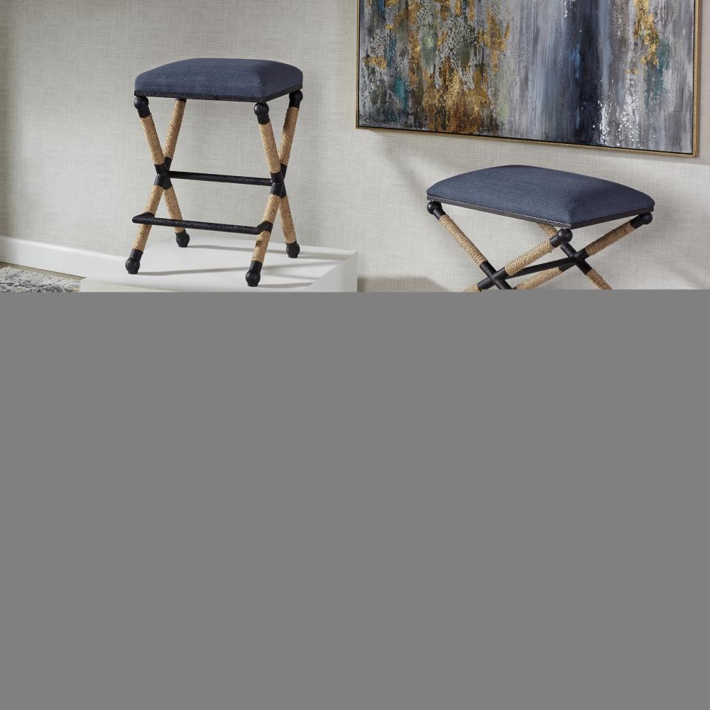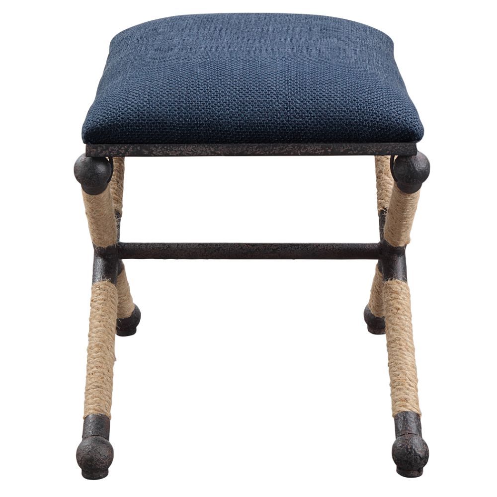 Rustic Iron Frame with A Nautical Touch, Wrapped in Natural Fiber Rope Accents. Cushioned Top is A Cotton Blend in A Rich Textured Navy Blue.