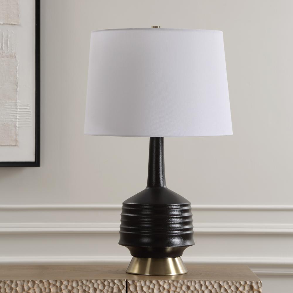 This Table Lamp Features A Ribbed Ceramic Base Adorned In A Lightly Textured Black Glaze, Displayed On A Plated Antique Brass Tapered Foot. The Tapered Round Hardback Shade Is Covered In A Crisp White Linen Fabric.