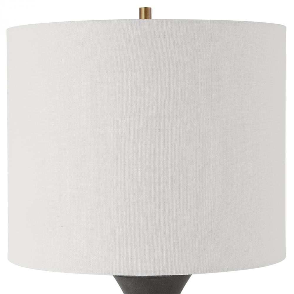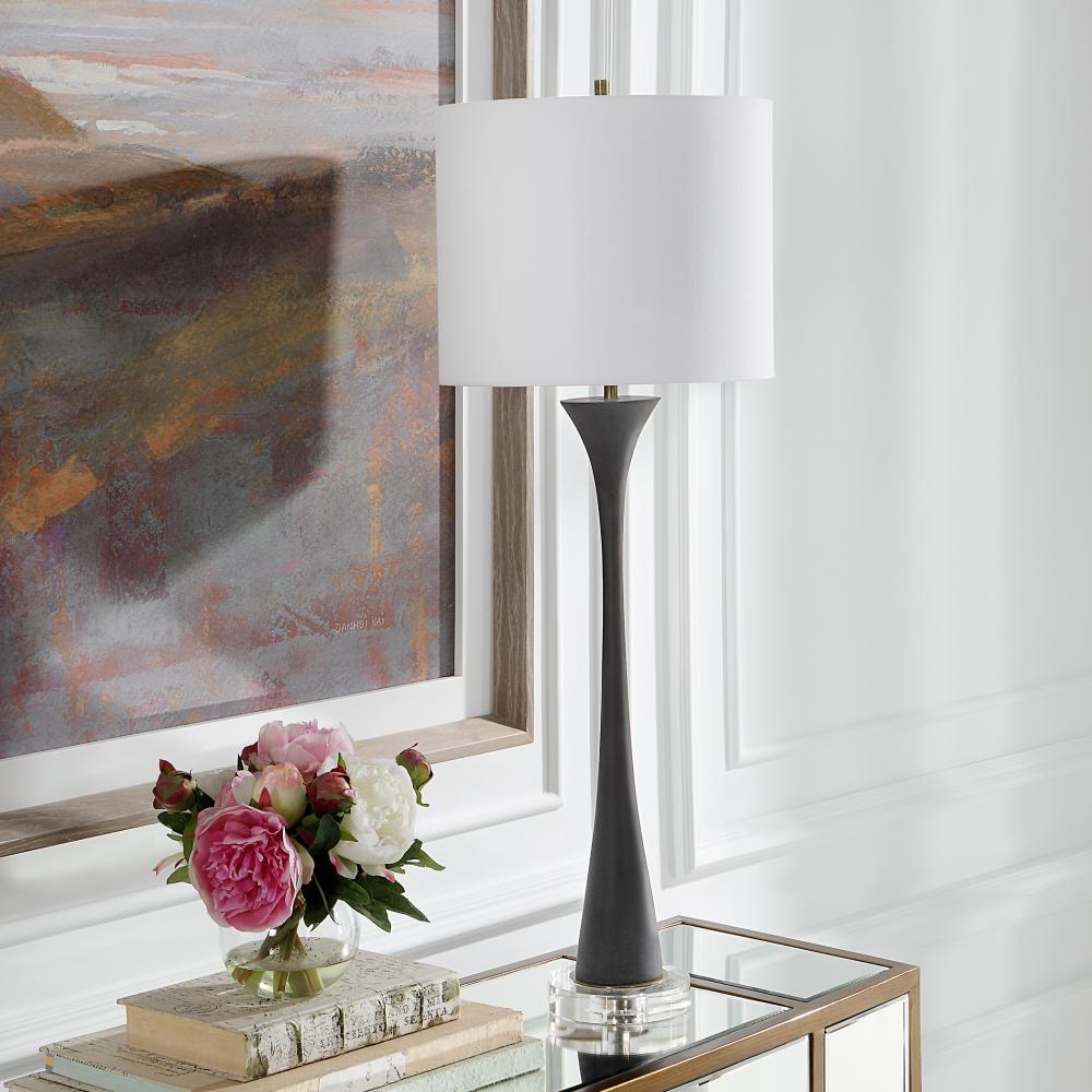 Showcasing A Classic Trumpet Shape, This Buffet Lamp is Handcrafted From A Man-made Black Stone, Displayed on A Thick Crystal Foot, Paired with Brushed Brass Plated Accents. A White Fabric Shade Completes The Piece.