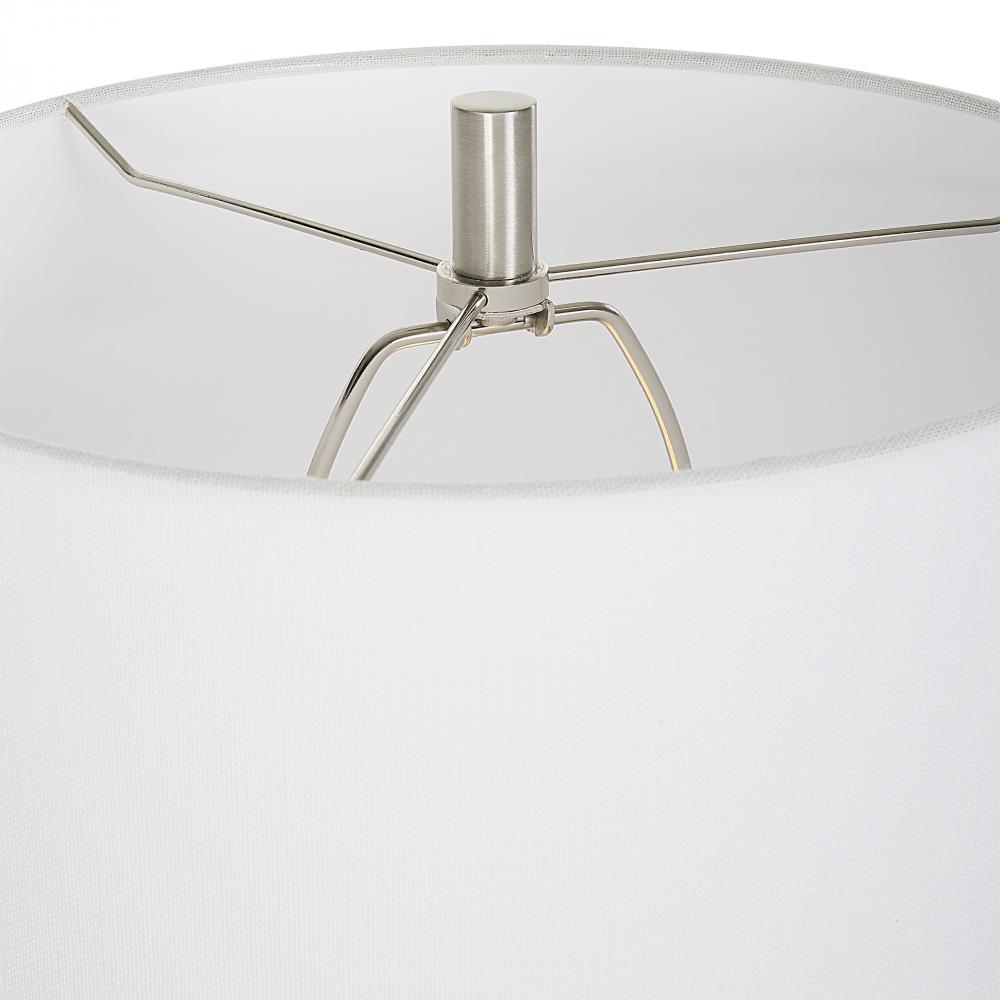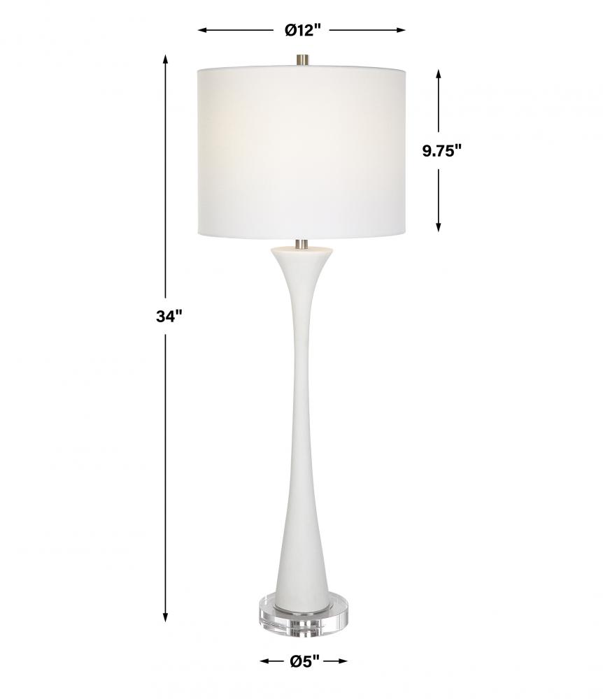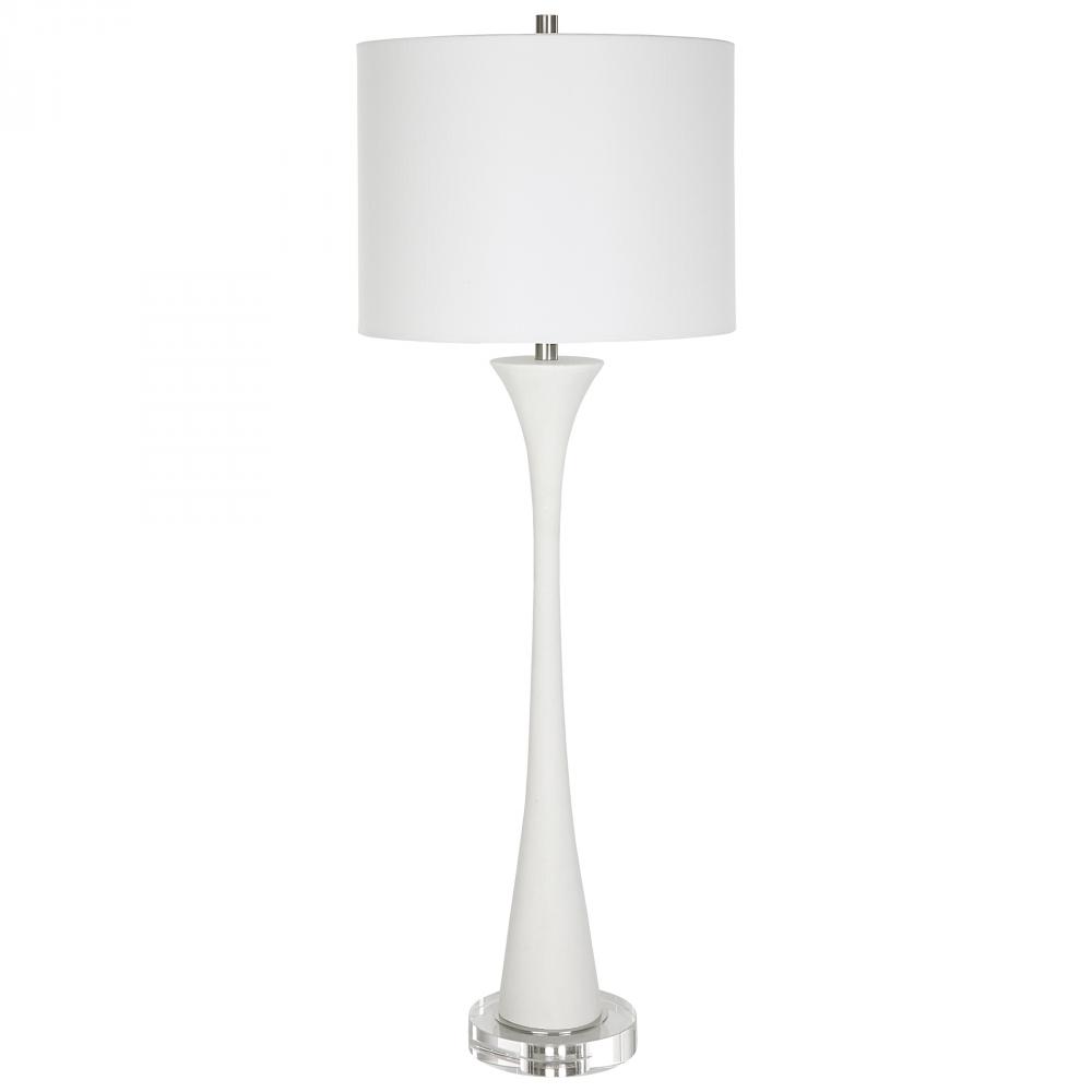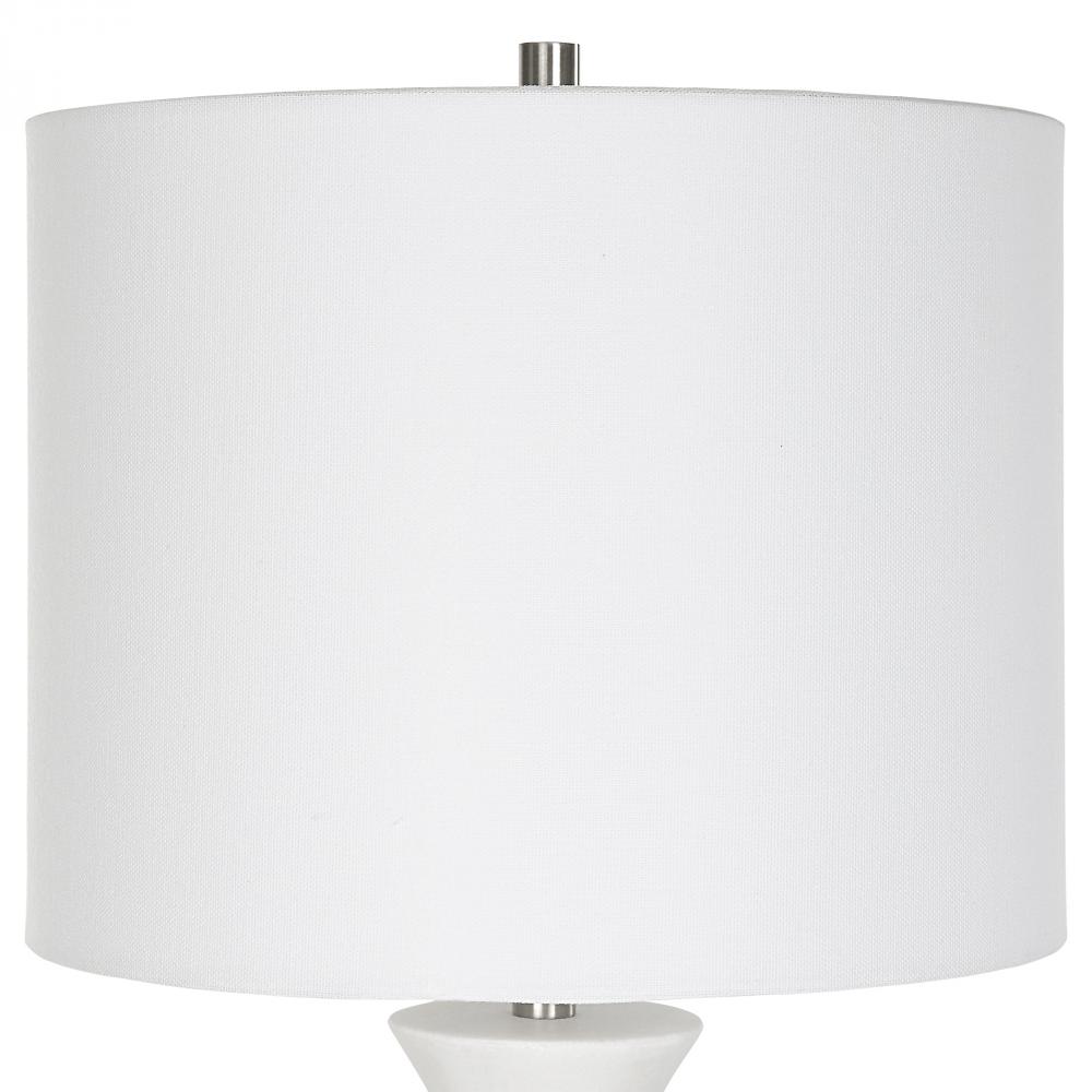 Showcasing A Classic Trumpet Shape, This Buffet Lamp is Handcrafted From Ivory Man-made Stone That Accurately Replicates The Look of Thassos Marble, Displayed on A Thick Crystal Foot, Paired with Brushed Nickel Plated Accents. A White Fabric Shade Completes The Piece.