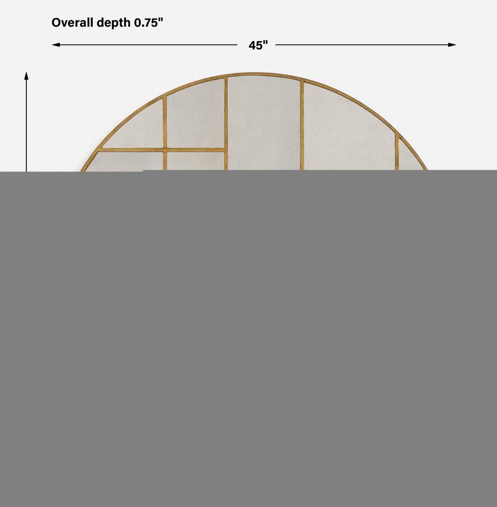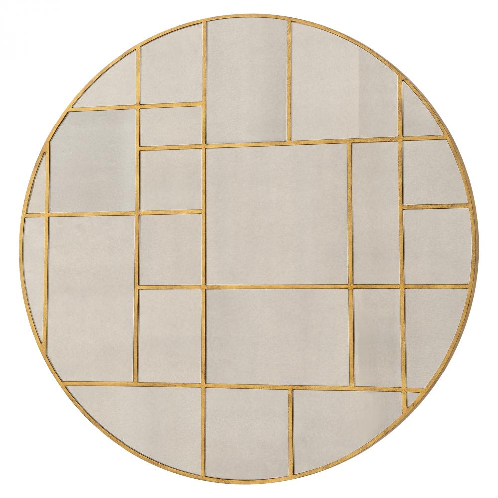 This Round Mirror Is Adorned With A Geometric Grid Pattern Encasing Individual Mirror Inlays, Finished In A Lightly Antiqued Gold Leaf That Exudes Timeless Elegance And Contemporary Flair.