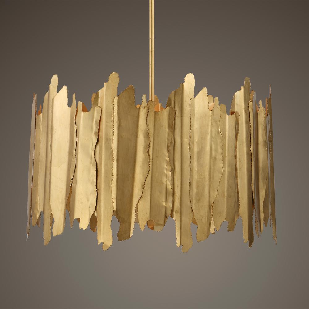 Industrial Metal Segment Sheets Welded with Rough Cut Edges Juxtaposed with A Gold Leaf Finish Give An Elegant Look to This Chic Pendant. 8-60 Watt Max Candelabra Sockets. Bulbs Not Included. Supplied with 15' Wire, 3-12" Stems and 1-6" Stem for Adjustable Installation.