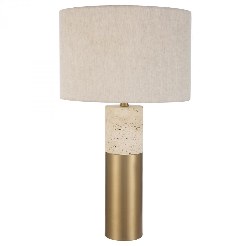 The Gravitas Table Lamp Lives Up to Its Name with Its Sophisticated Finishes and Design. The Iron Column Base is Finished in An Elegant Plated Brushed Brass with A Porous Ivory Stone Top. The Lamp is Paired with A Casual Light Beige Linen Shade with Subtle Texture.