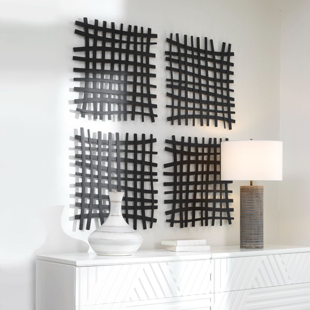 This Solid Iron Wall Panel is Constructed in An Abstract Grid Pattern, Finished in Matte Black. May Be Hung Four Ways.