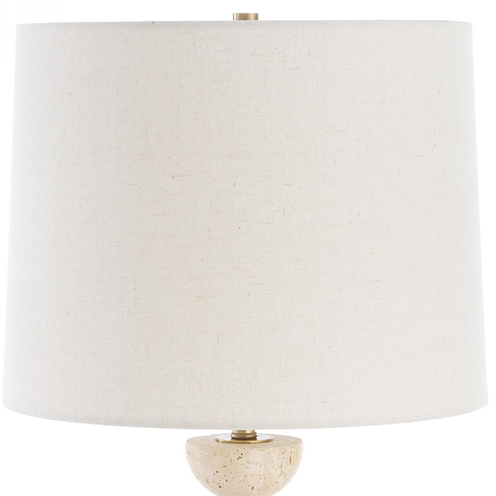 The Hemisphere Buffet Lamp Showcases A Sleek Brushed Brass Base, Elegantly Accented By Two Travertine Half Spheres At Either End, Adding A Touch Of Refinement. The Slightly Tapered Round Hardback Shade Is Covered In An Oatmeal Linen Fabric With Light Slubbing.